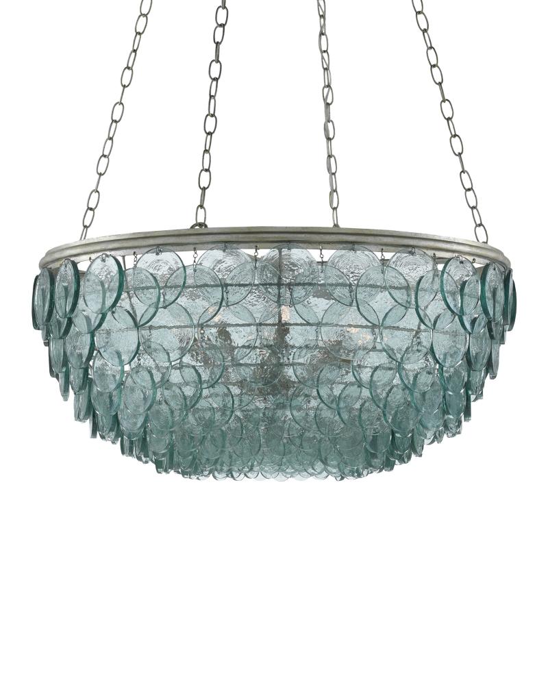 Recycled glass discs dangle from the wrought iron frame of the Quorum Small Chandelier. These overlap to form a textural shade that turns the light emanating through the glass into a mottled mosaic. The frame in a silver leaf finish anchors the turquoise glass chandelier. Adjustable from 35" to 86.5" with use of included chain/rod kit/cable. If your space calls for a longer drop, additional chain/rods/cable is available for purchase.