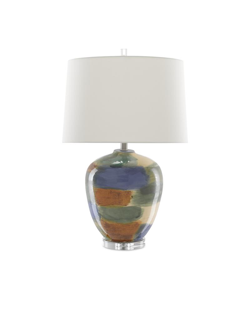 With a surface that only an artisan could create, our Rainbow Table Lamp is made of porcelain onto which swaths of blue, green, sand, and rust hues have been applied. Sitting atop a clear optic crystal base, the multi-colored lamp is fitted with an ivory shantung shade.