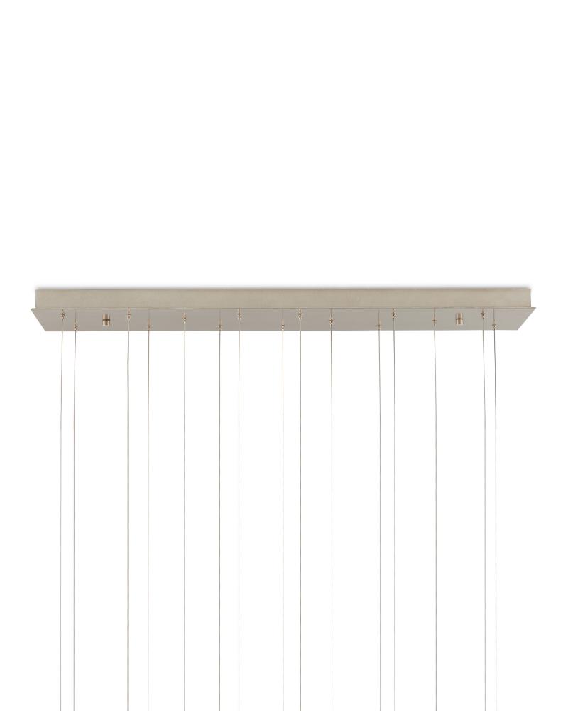 The Rame Rectangular 15-Light Multi-Drop Pendant has teardrop-shaped shades made of mercury glass with silver on the inside and copper on the outside. The personality of the patterns on the glass is evident whether the lights are switched on or not but when illumination brightens the shades, the effect is dazzling. The canopy of this piece is luminous in a painted silver finish. This fixture is among Currey & Company's multi-drop pendant collection, which includes multiple configurations.