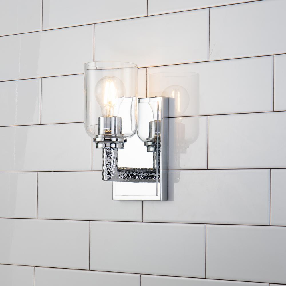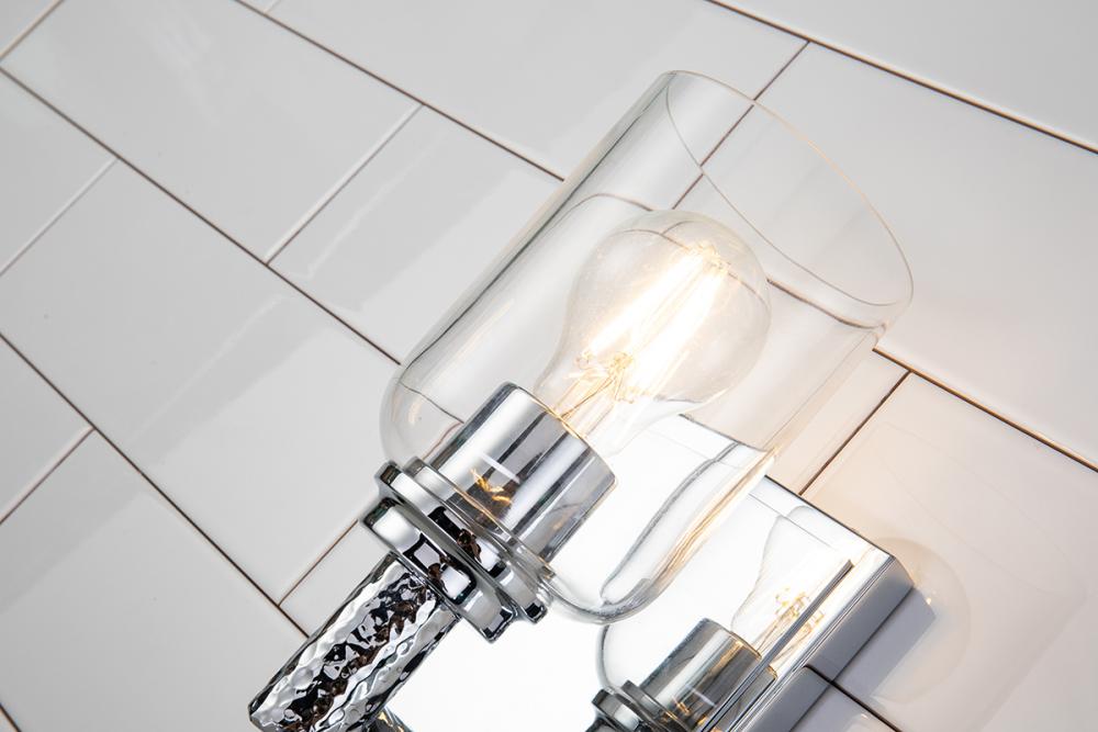 A 5" polished chrome sconce with hammered detail and curved cylinder glass. Its rustic-modern design offers beauty and function, perfect for mirror sides in bathrooms.