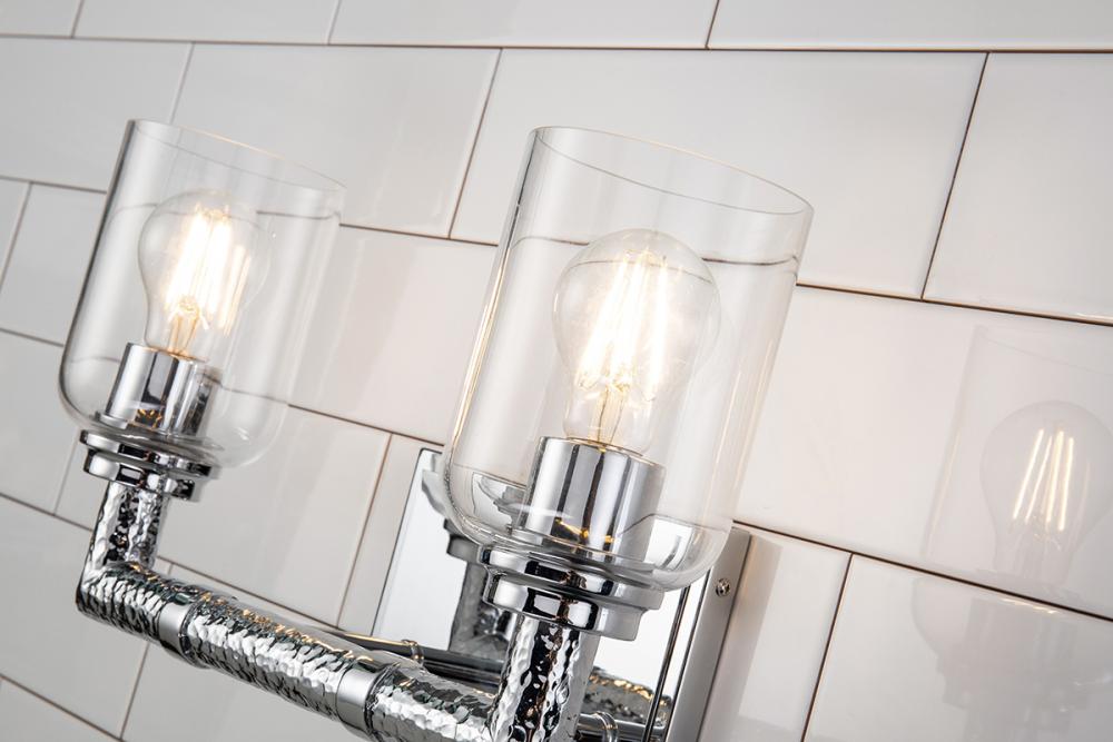 A 15.5" polished chrome vanity light with hammered detail and two curved cylinder glass shades. Its rustic-modern style shines over bathroom mirrors with beauty and function.