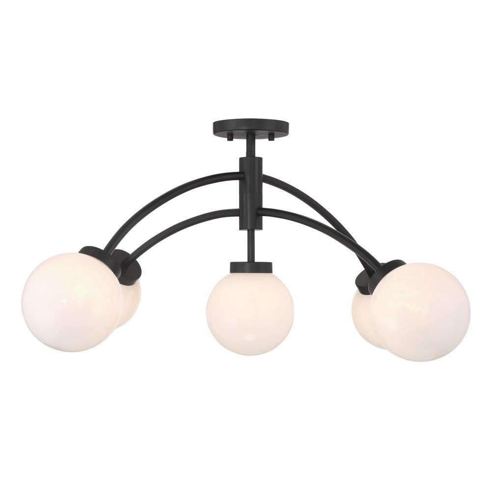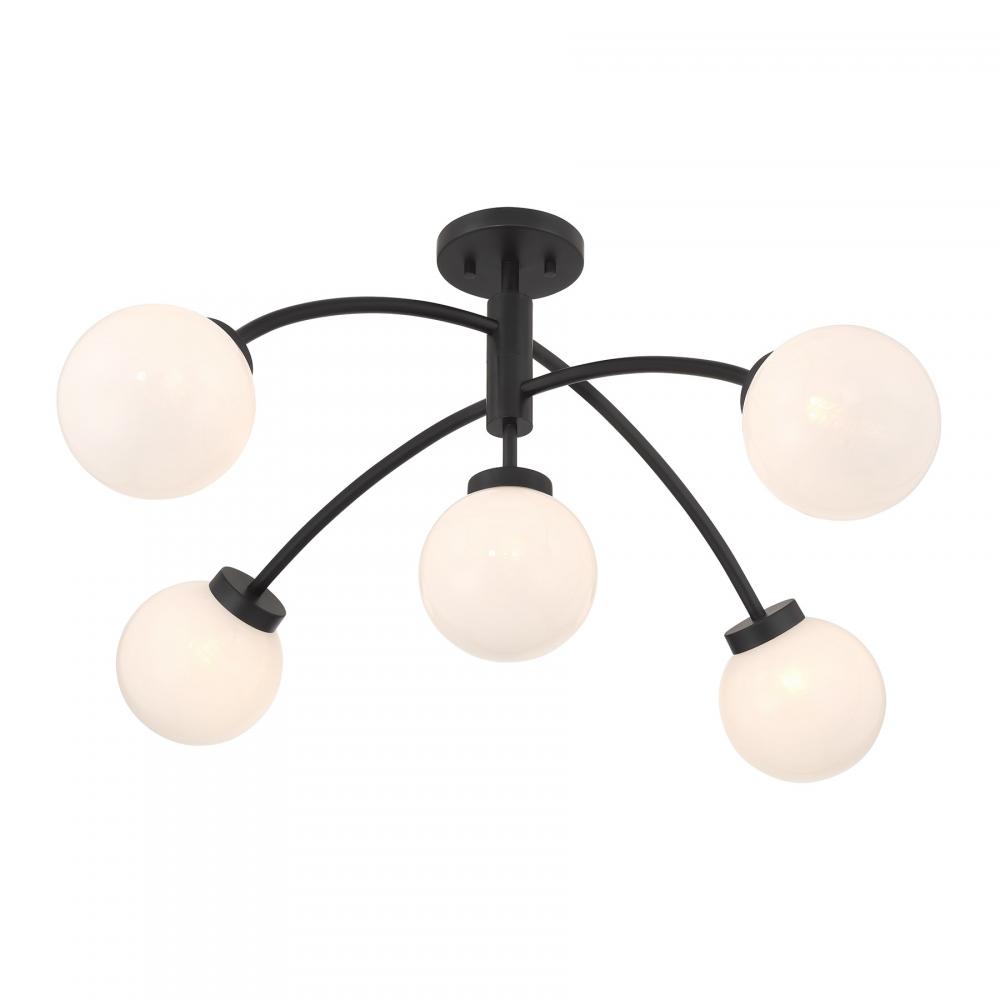 Bring in the big, bright and bold Savoy House Redfield 5-light semi-flush mount! Dazzling with mid-century modern inspiration, its curving arms hold orbs of swirling, stunning white strie glass that pairs beautifully with the Matte Black finish. Redfield is 16" in height and 36" in width, making it an excellent choice for illuminating large rooms. It uses five G9 LED bulbs of up to 3.5 watts per bulb. Bulbs not included.