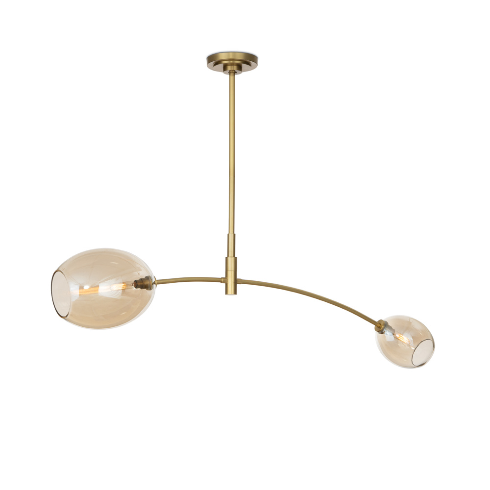 The Artemis Double Pendant masterfully balances simplicity with artisanal craftsmanship, featuring Champagne glass globes elegantly positioned at each end of its mobile-inspired, arched arm in natural brass finish. This striking fixture exudes a modern vibe, making it a standout addition to any space.