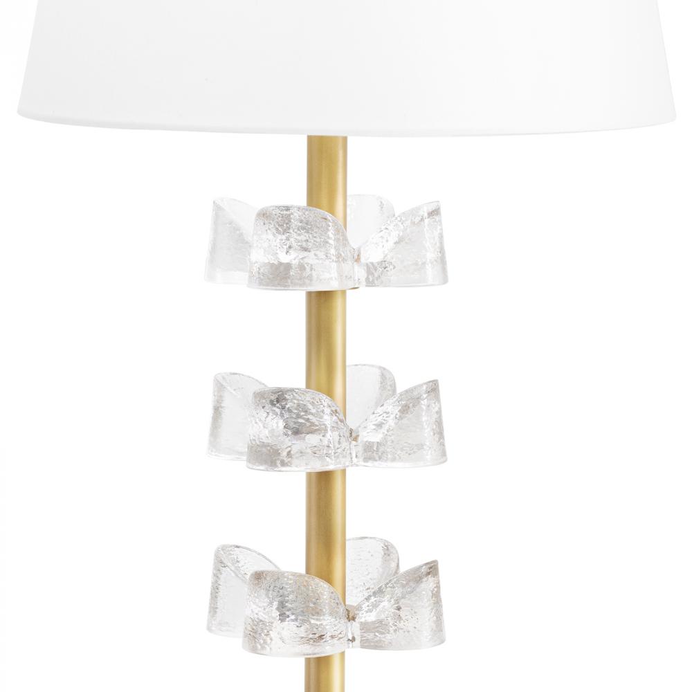 Feminine and fun, the Bella Table Lamp showcases tiers of hand-crafted cast glass flowers gracefully suspended along a natural brass finished base. The sleek and simple design of its body paired with the delicate accents creates a beautiful combination of