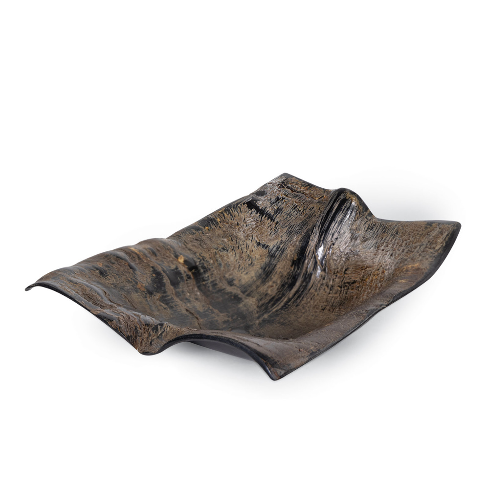 Handcrafted in India from natural horn and delicately balanced on a graceful curve, the Brock Horn Dish stands alone as an object of interest or to display curated objects with a rough-hewn artisanal touch.