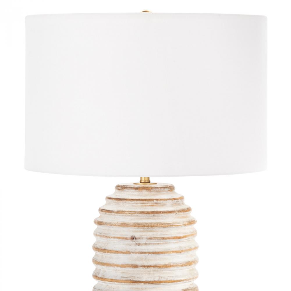 The Carmel Table Lamp's wood body is white-washed and distressed like driftwood that has been aged by the sun and sea. Carved ridges run along the entire body of the lamp, which is topped with a large drum shade and natural brass ball finial. Whether i