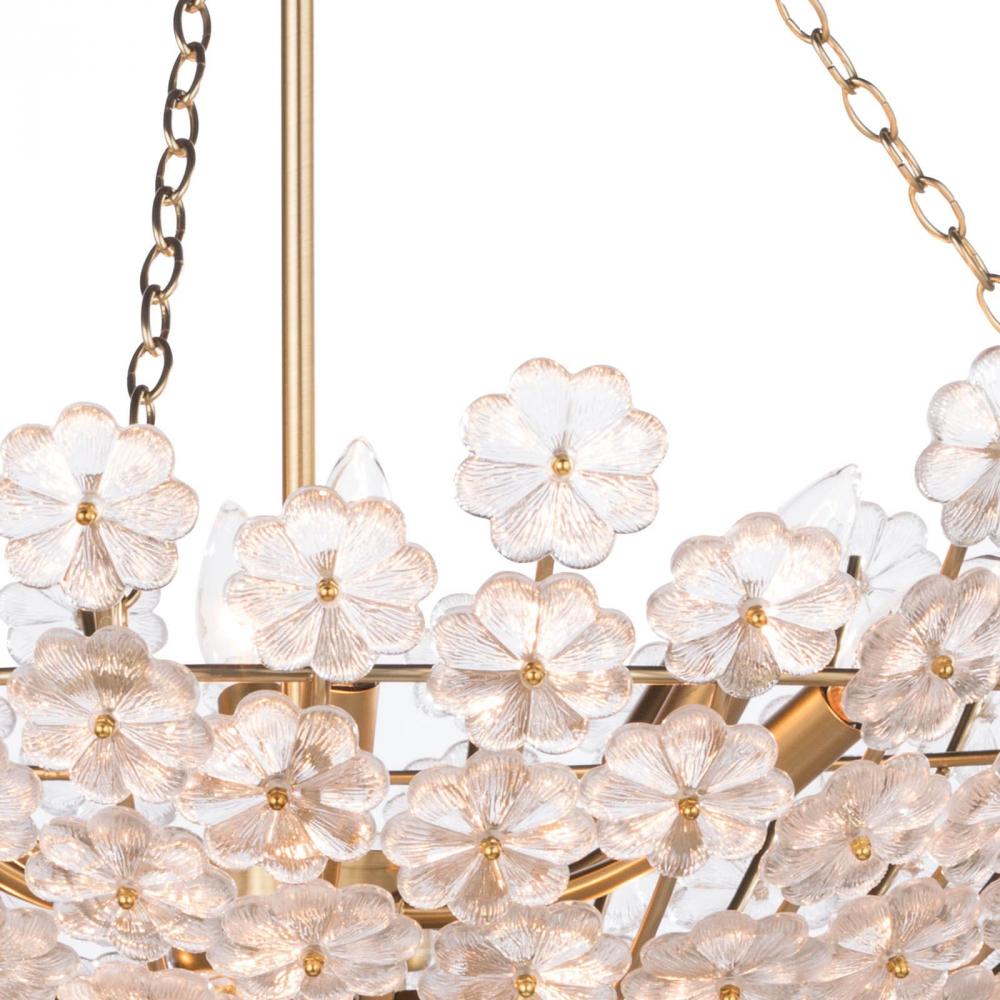 Even more beautiful in person, the detail on the cast glass flowers is breathtaking. Carefully crafted, this light and airy natural brass fixture will add feminine sophistication to an entryway, foyer, or dining room.