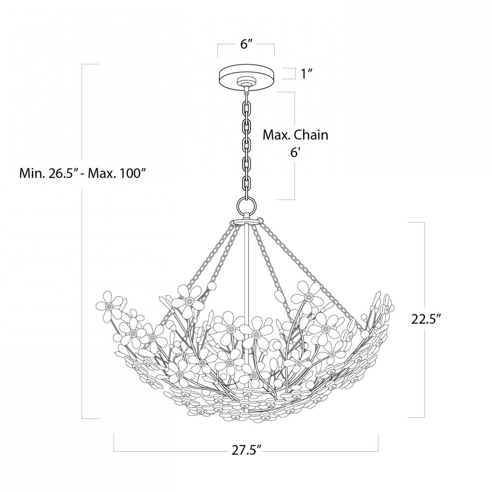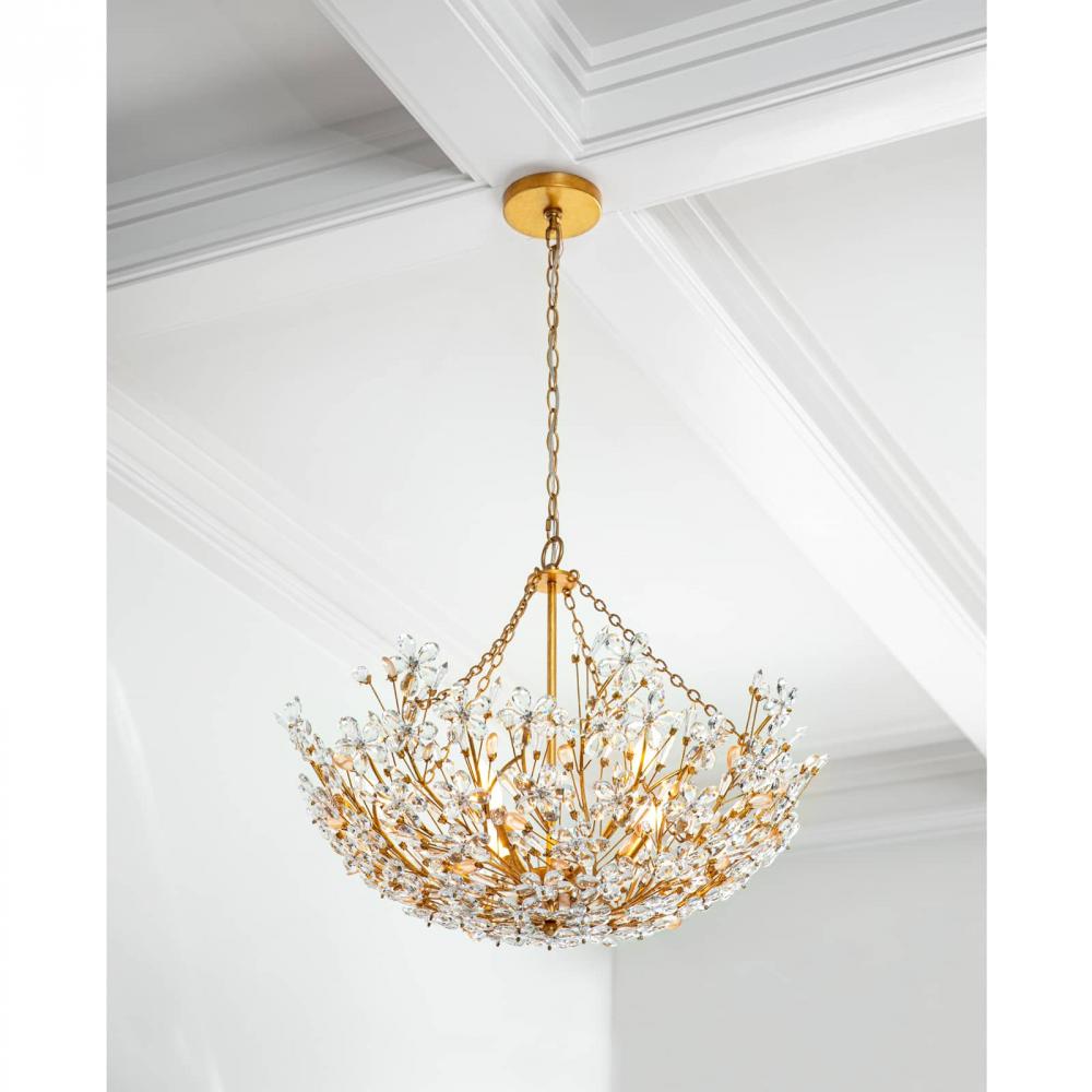 Delicately crafted crystal flowers suspended by gold basin frame, gives this pendant a strikingly romantic feel. The hand-polished flowers refract light into brilliant sparks, making this fixture a truly dazzling statement piece.