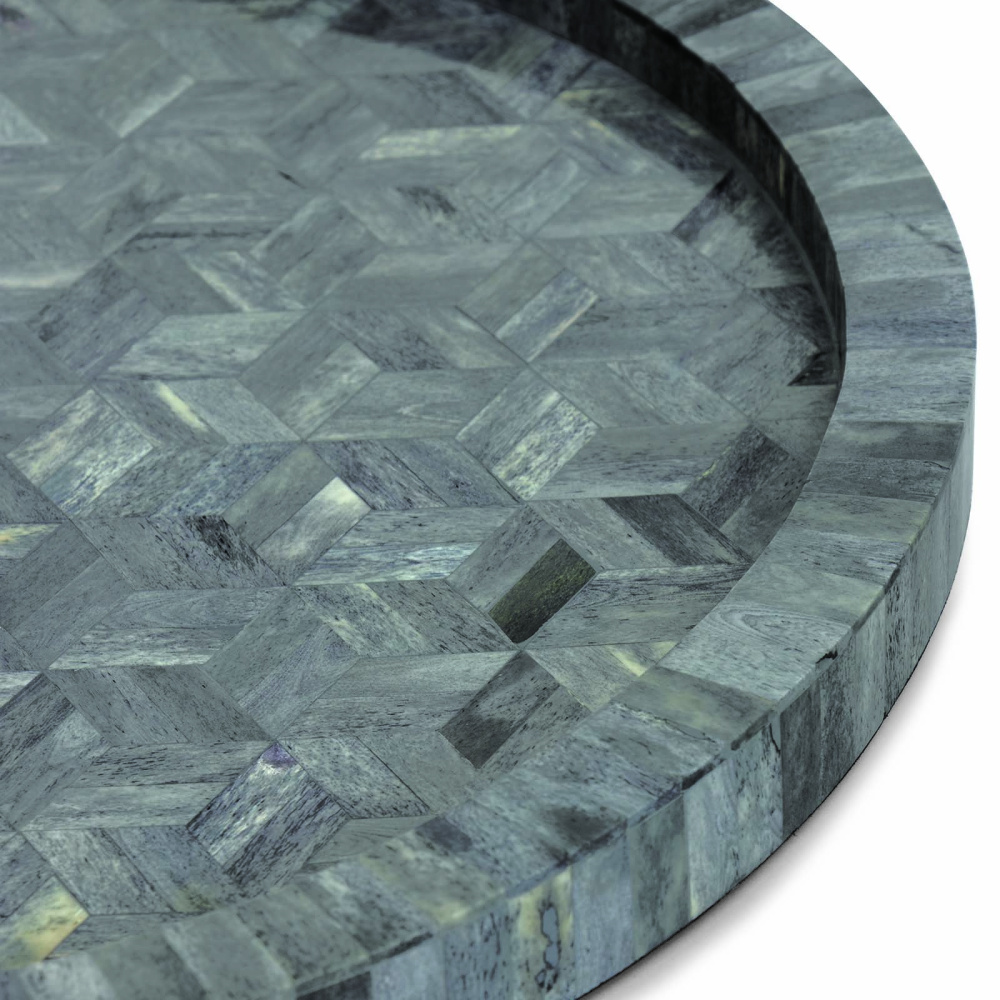 Handcrafted in India, the Jullian Round Bone Tray in grey catches the eye with a veneer of mosaic bone art in a delicate floral pattern. You’ll find so many reasons to use this unique decorative tray – and never put it away. Perfect for wine and cheese pairings at your next event, to display a collection of meaningful trinkets or a cluster of candles to set the mood.