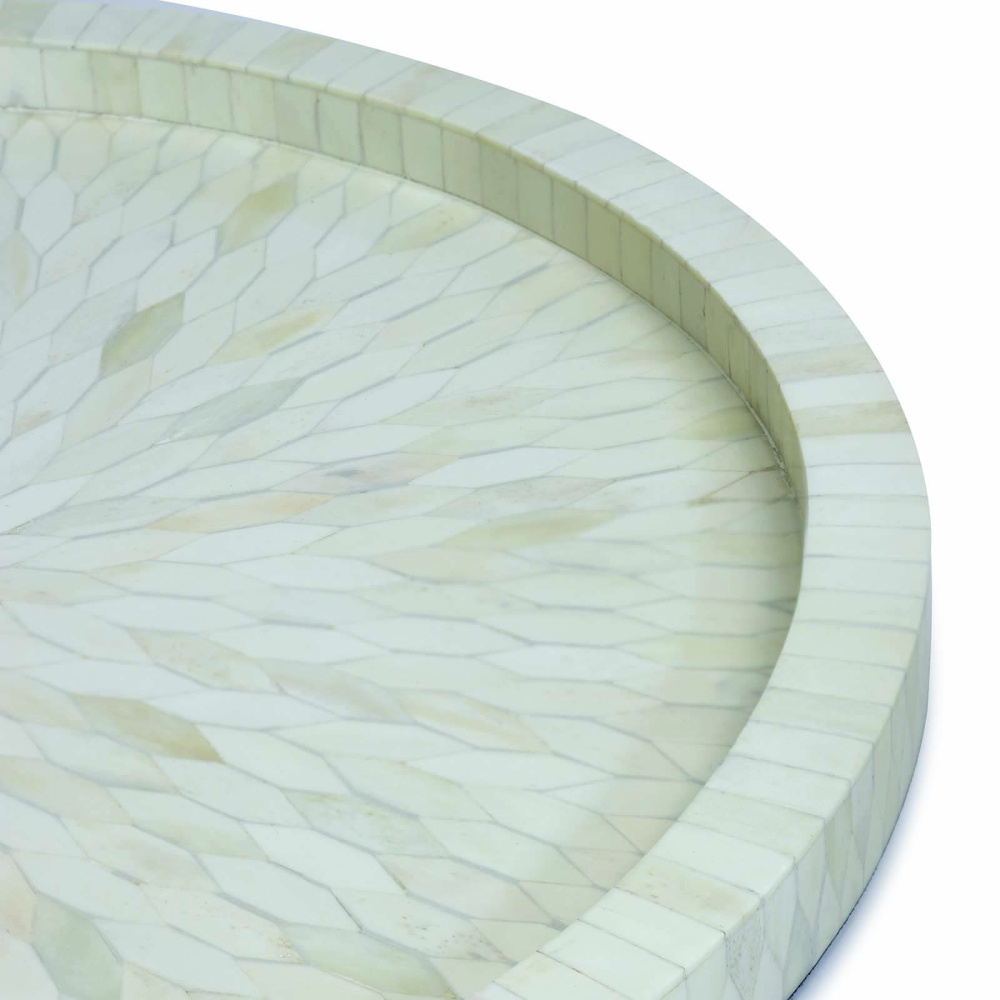 Handcrafted in India, the Jullian Round Bone Tray in creamy white catches the eye with a veneer of mosaic bone art in a delicate floral pattern. You’ll find so many reasons to use this unique decorative tray – and never put it away. Perfect for wine and cheese pairings at your next event, to display a collection of meaningful trinkets or a cluster of candles to set the mood.