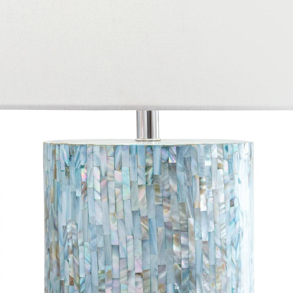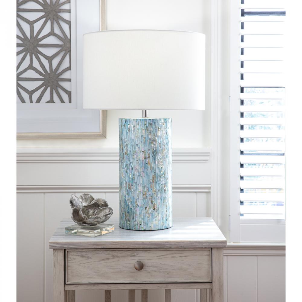 Like the shimmering light of the sun atop water, Layla's azure blue, mother-of-pearl tiles create the same dazzling effect. Place this modern column lamp in a seaside cottage or a contemporary loft. It is the perfect chameleon of style, adding a bit o