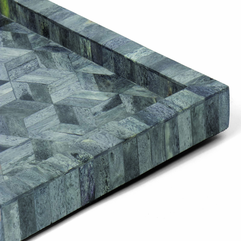 Handcrafted in India, the Montara Square Bone Tray in grey catches the eye with a veneer of mosaic bone art in a beautiful three-dimensional parquet pattern. You’ll find so many reasons to use this unique decorative tray – and never put it away. Perfect for wine and cheese pairings at your next event, to display a collection of meaningful trinkets or a cluster of candles to set the mood.