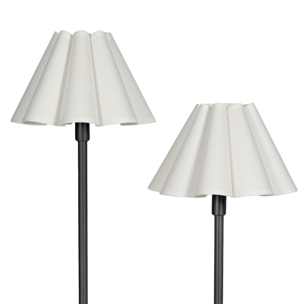 The Polly Floor Lamp exudes timeless elegance with its two white scalloped shades, casting a soft, comforting glow that brightens any room with its crisp, clean hue. The lamp’s asymmetrical base adds a touch of artistic flair, creating a multi-level