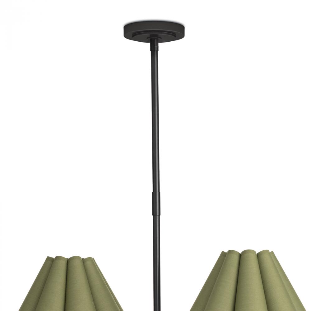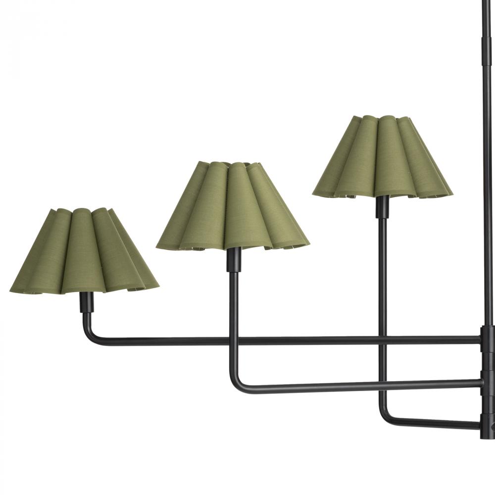The Polly Chandelier embodies grace and versatility with its six shades, delicately crafted from green linen and sewn into a charming scalloped pattern. Its multi-tiered design, coupled with Blackened Brass rotatable arms, offers flexibility in configurati