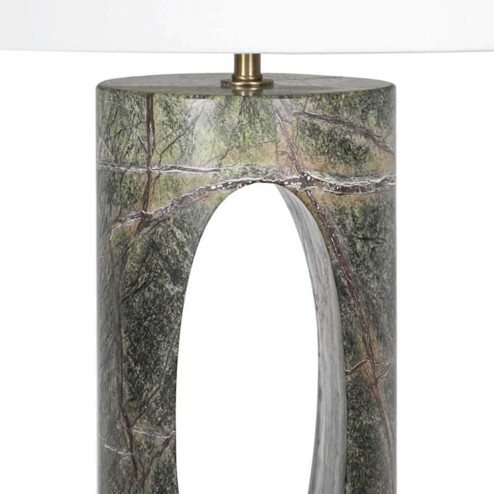The Portia Marble Table Lamp is crafted with a stunning natural marble in a shade of deep forest green. Its captivating form draws attention as a sculptural work of art. Paired with a crisp, natural linen shade and natural brass components, the Portia woul