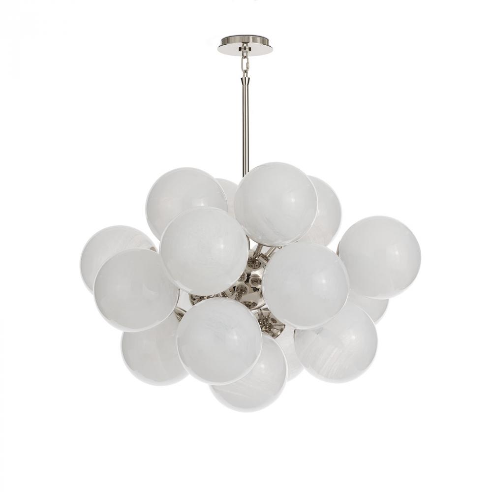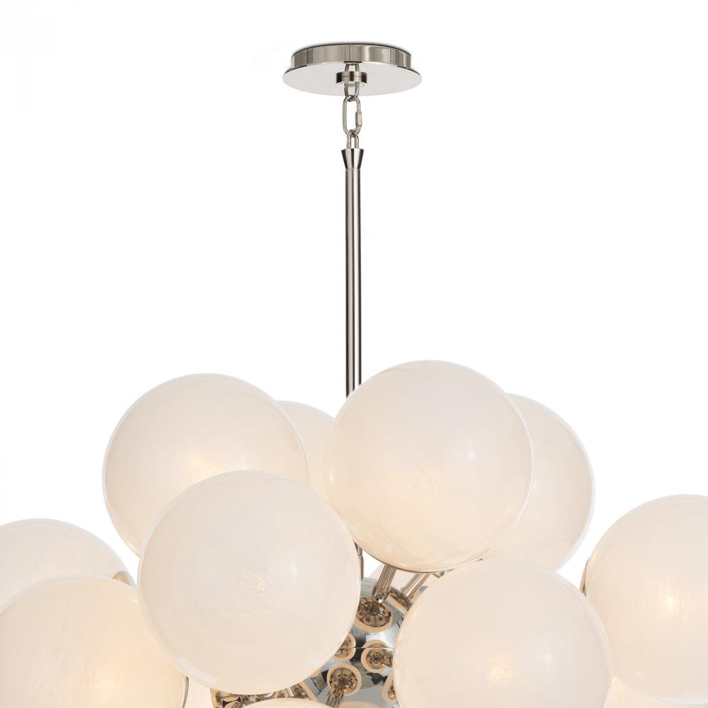 The Shine Chandelier is a beacon of joy, evoking the whimsy of a cluster of balloons with a nod to mid-century modern aesthetics. Shine's captivating white swirled glass globes offer a dramatic 60s or 70s vibe set in a polished nickel frame. The chande