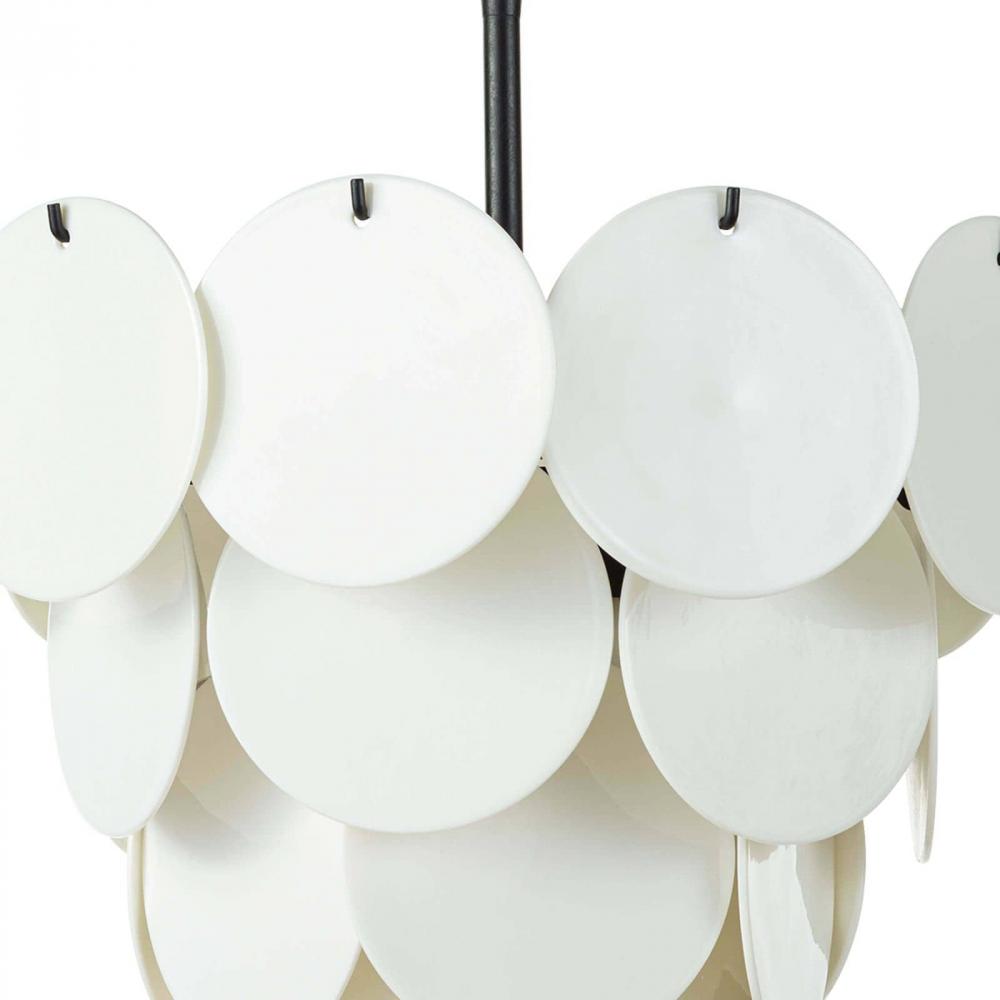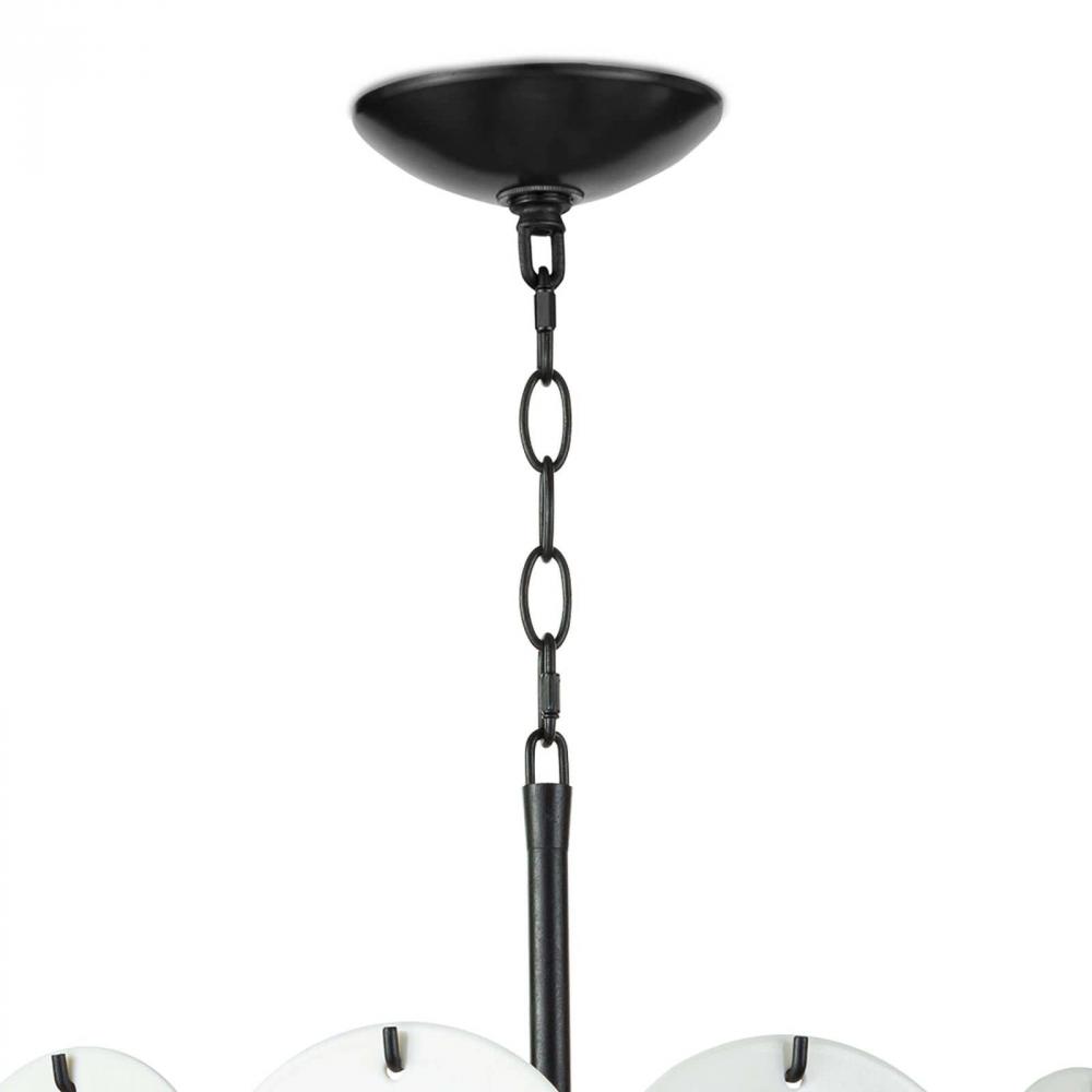 White glass discs hang from a simple, blackened iron frame giving the Solstice Chandelier its distinct, modern appeal. This crisp, sculptural pendant is a beautiful piece both illuminated or not.