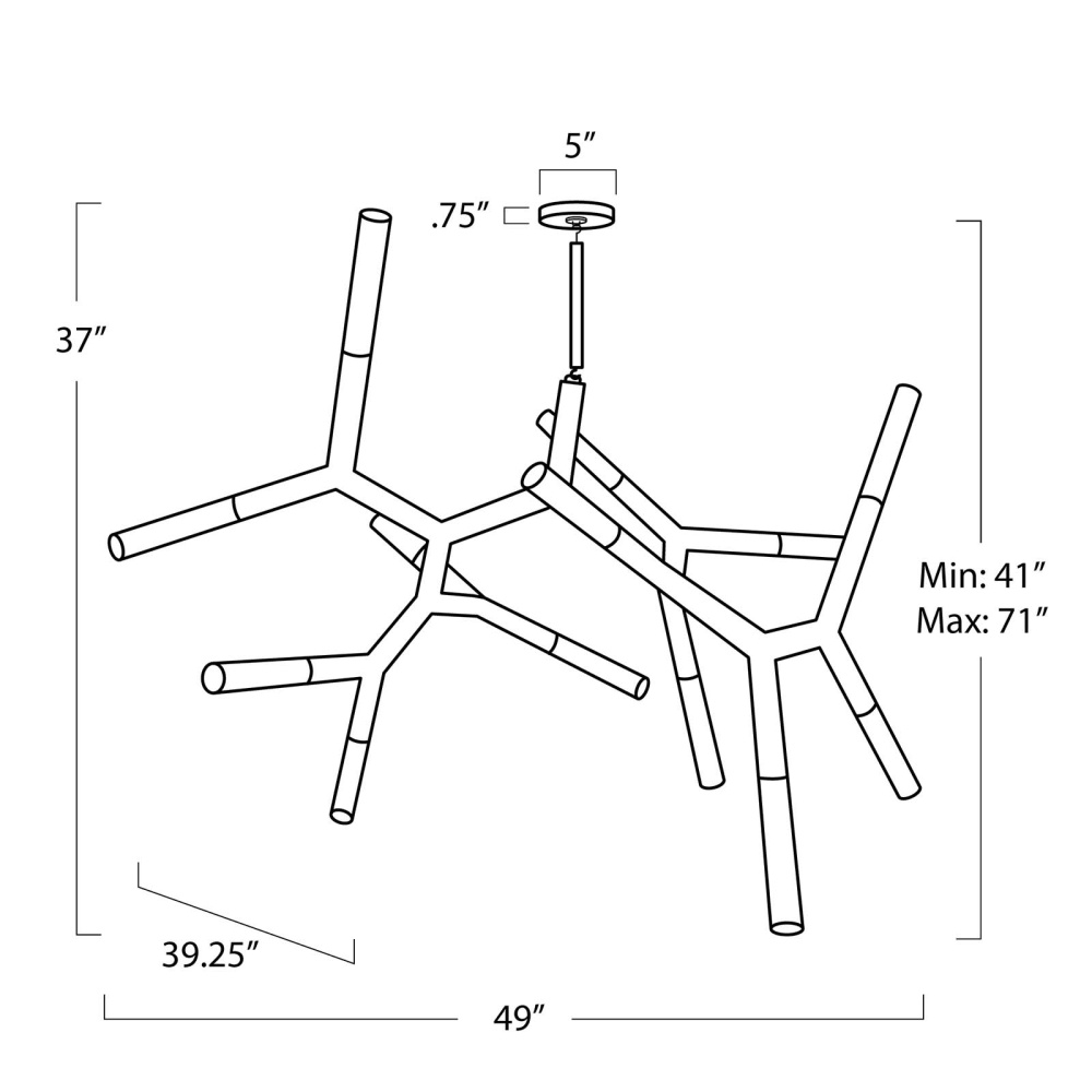 Traveler Chandelier Large is the epitome of modern dynamism with its multiple branching end points finished in custom frosted acrylic bulb covers. Expertly engineered to hang at a slight angle, place this sculptural wonder over a table, in an office, or en