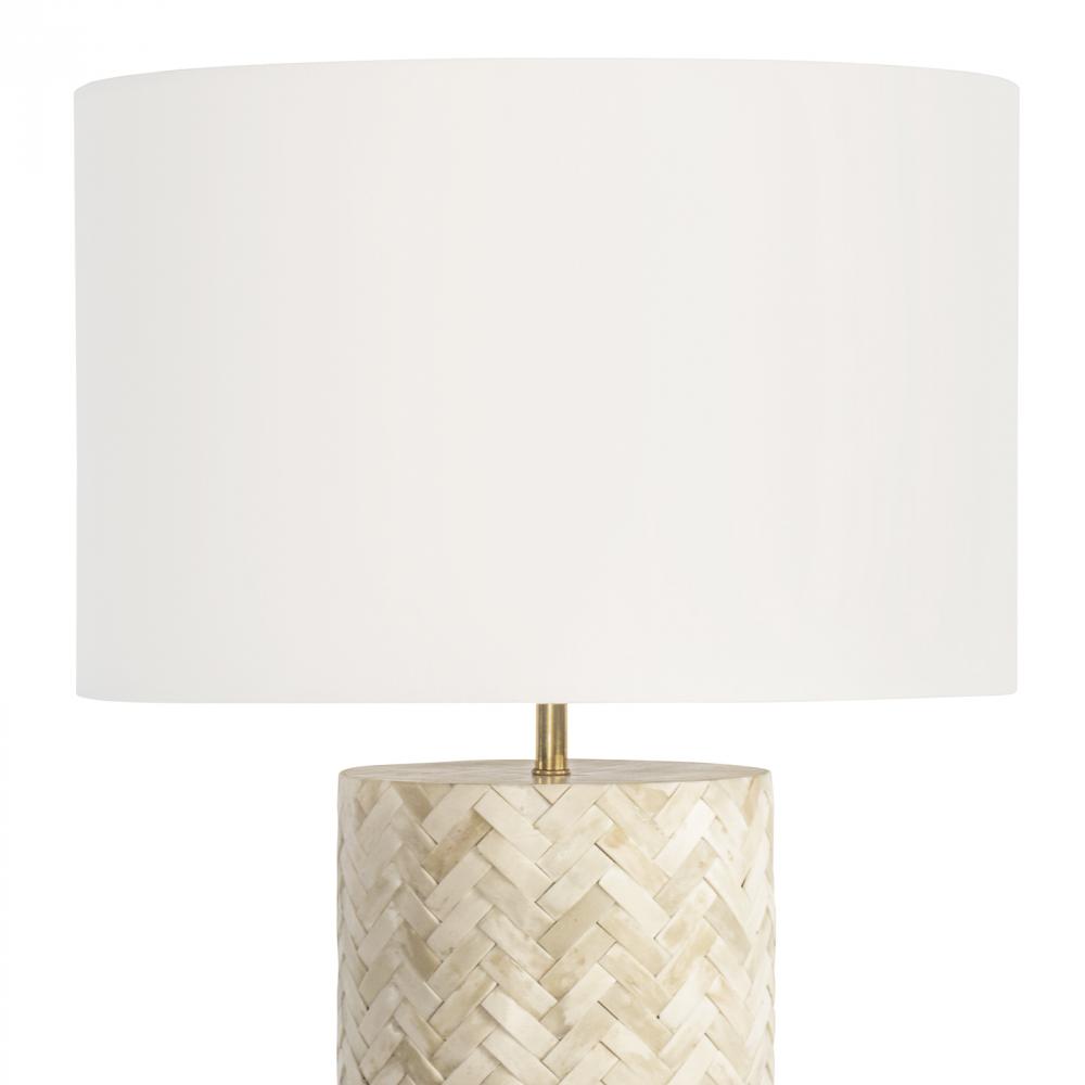 Natural bone is hand-inlaid onto the column base of the Trellis Table Lamp in a classic herringbone pattern. The varying tones of the bone create a beautiful mosaic effect and a texture that summons eyes for a closer look. Place this substantial lamp in an