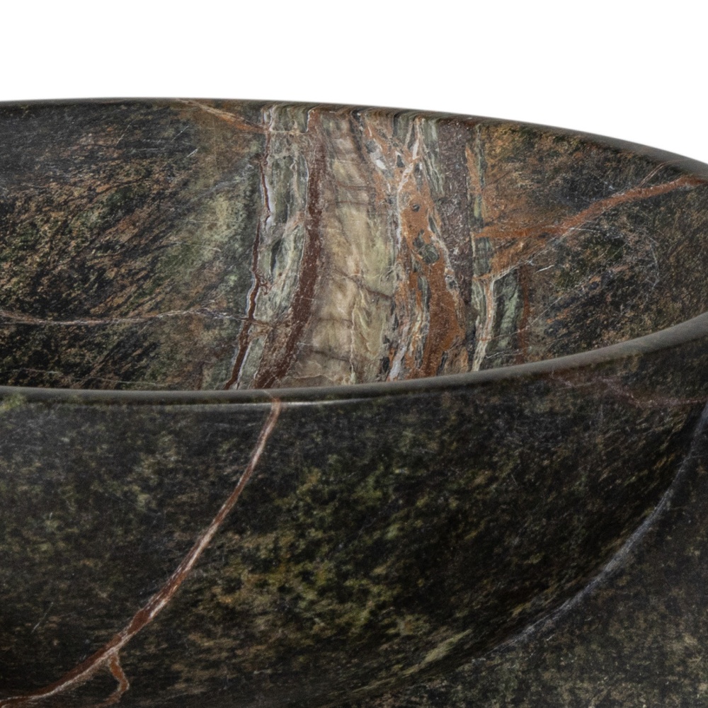 A modern X-shaped base, earthy details and dark veining define the Large Tribune Bowl. Crafted from heavy, forest green marble, this weighty piece is available in two sizes, ideal for pairing on a console or bookshelf.