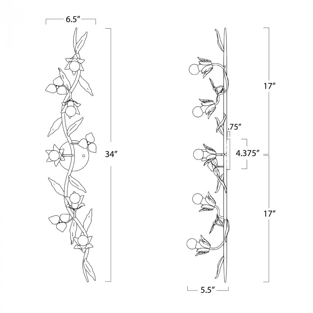 Trillium Sconce; Dimensions 6.5W x 34H x 5.5D; Uses five maximum 60 Watt E12 Base Bulbs (Not Included)