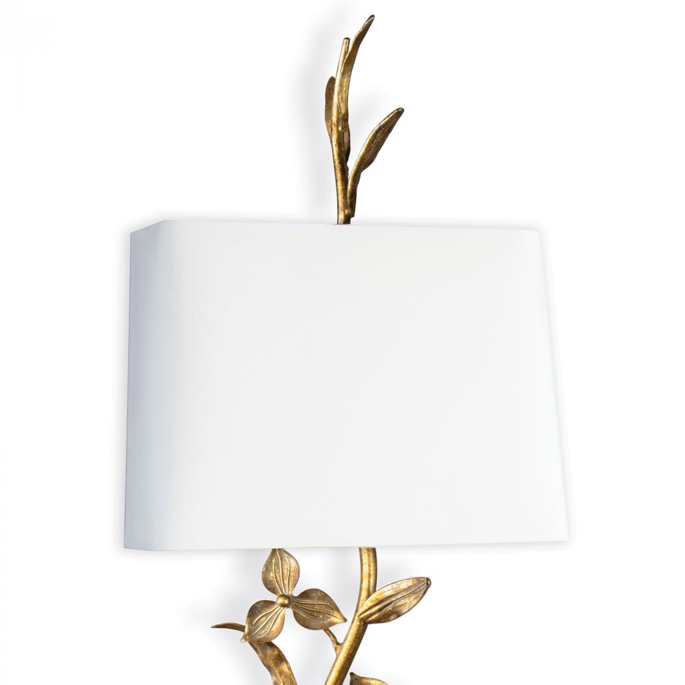 Balancing Old World elegance with rustic charm, each branch of the Trillium Shaded Sconce is cast and gilded in an antique gold leaf finish. A classic, natural linen shade and matching, cast leaf finial completes the masterpiece. Place in a bedroom, living