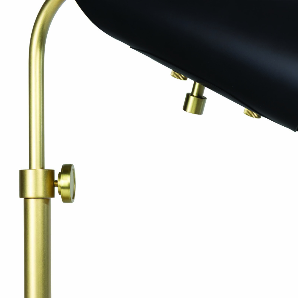 Mid-century modern meets art deco in classic black and natural brass. The elegant Vest Table Lamp is sharp as a tuxedo but never stiff. An adjustable metal shade, adjustable height, and dimmer switch allow you to shine the right amount of light anywhere you choose. Creates strong symmetry in a pair but stands on its own as a task lamp or a perfectly tailored accent piece.