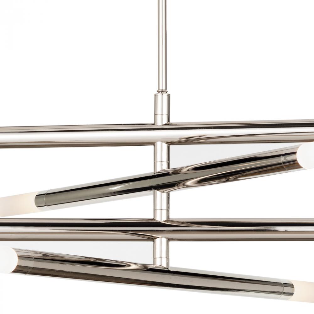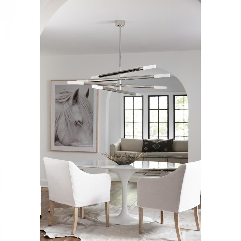 Four arms swivel around a center point on our modern, linear Wick Chandelier. Create a unique, dynamic design in your modern loft, entryway, or over a dining table. Wick's frosted acrylic bulb covers add the perfect amount of diffused light to your spa