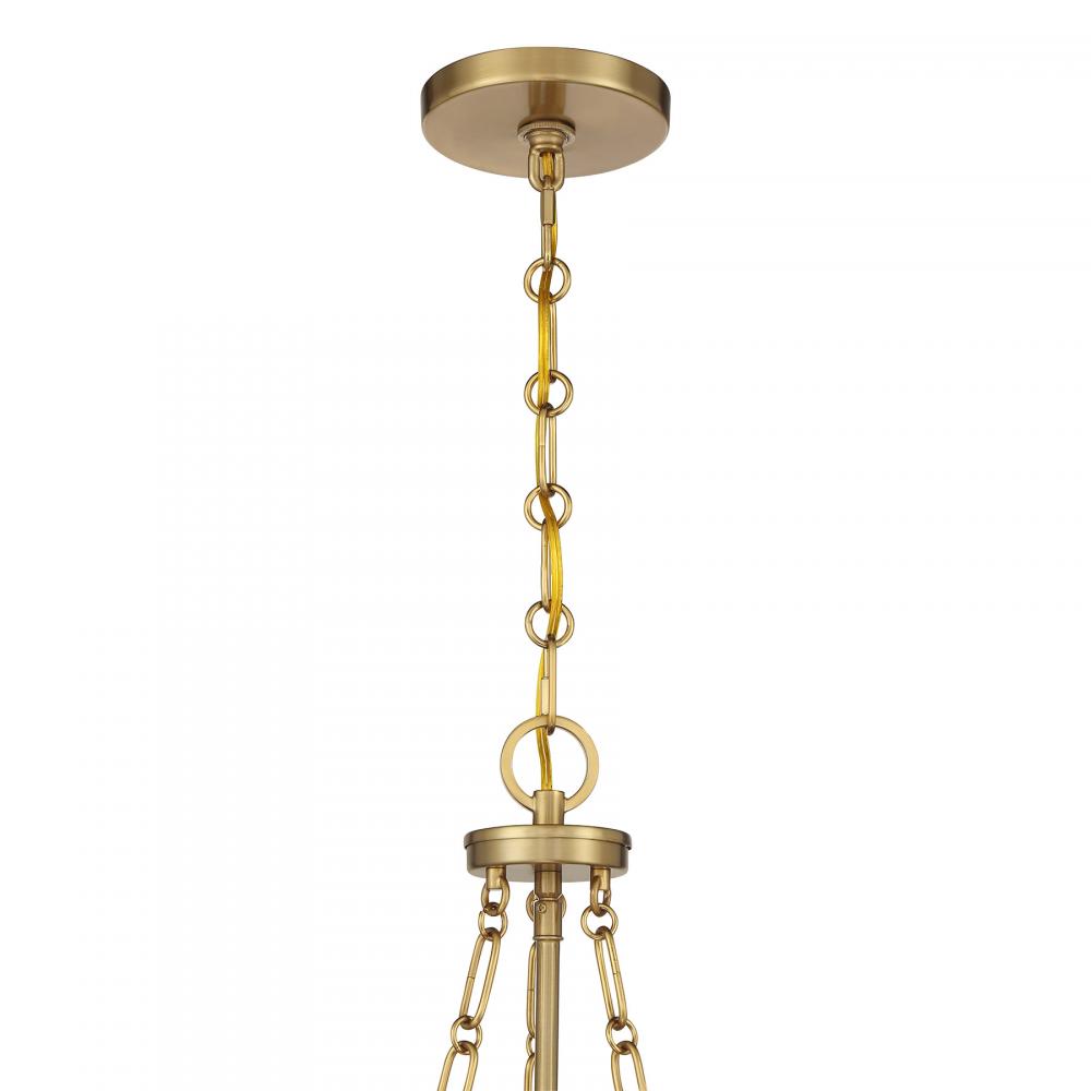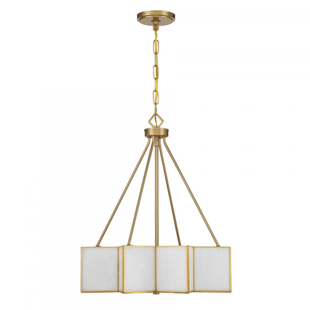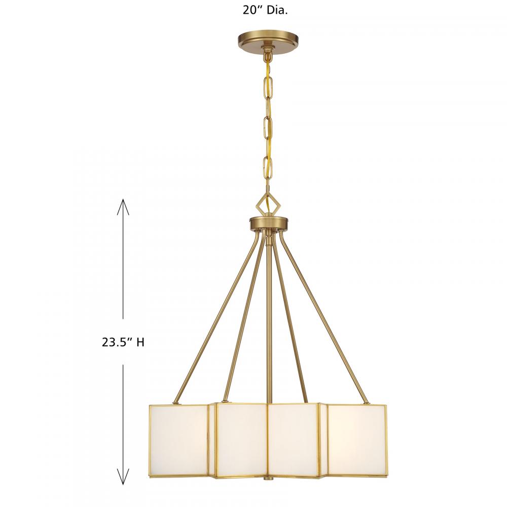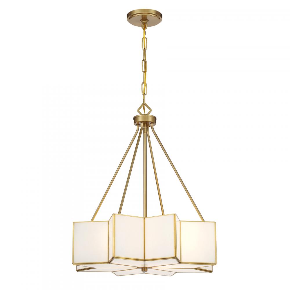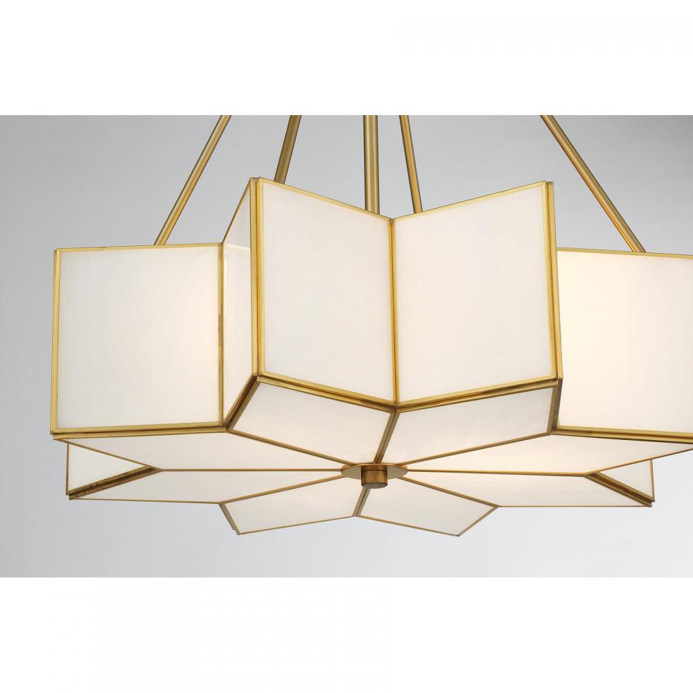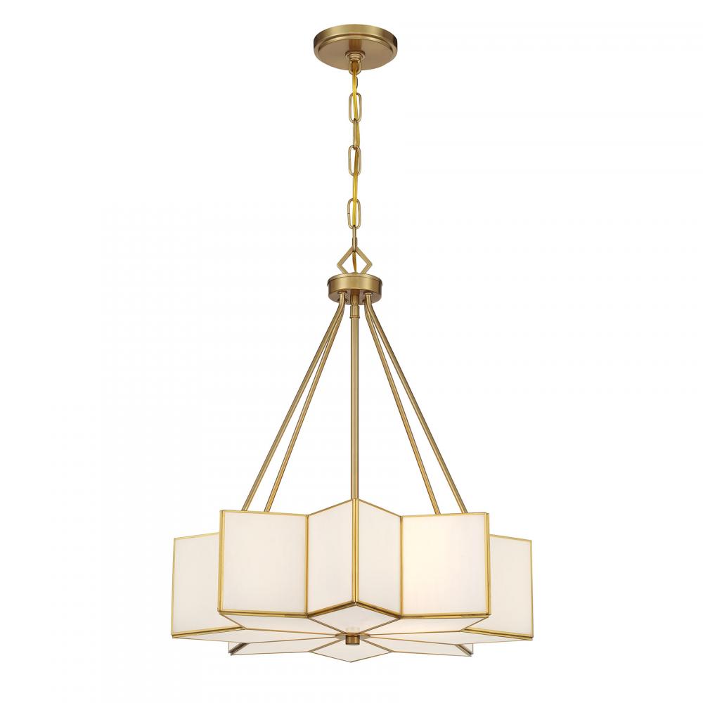 The Savoy House Reiling 3-light pendant is destined to shine in any space. Its eye-catching starburst shape is finished in Warm Brass and decorated with panes of white glass. It is the perfect choice for bringing in Art Deco style glamour! Reiling is 23.5" in height and 20" in width. It uses three standard size bulbs of up to 60 watts per bulb. Bulbs not included. Comes with 120" of chain.