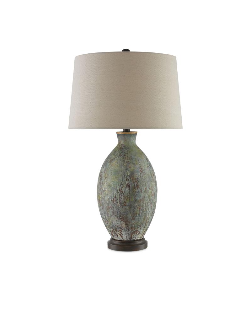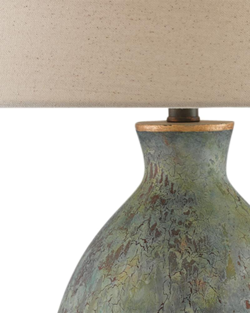 The heavily distressed Remi Table Lamp is made of terracotta that has been given an exquisite depth by artisans who have dripped green and dark red glazes onto its surface. The bronze gold finish of the hardware enhances the patina by giving the lamp the feel of aged copper. Due to the artisanal aspects of this lamp, each one is truly a one-of-a-kind creation. The only thing that remains predictable on each one is the flax linen shade.