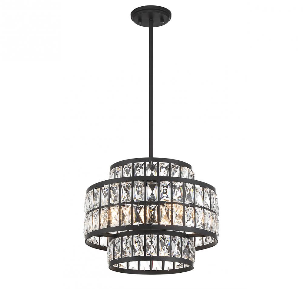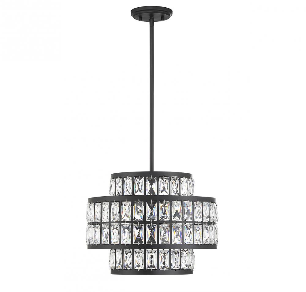 It is often said that lighting is the jewelry of the home and the Savoy House Renzo 3-light pendant is a perfect example of this saying. Faceted clear crystal decorates the two layers of shades, which overlap in an intriguing way and are finished in matte black. Renzo is 16" in width and has an adjustable height ranging from 18" to 66". Comes with four 12" downrods and one 6" downrod. It uses 3 standard size bulbs of up to 60 watts per bulb (bulbs not included).