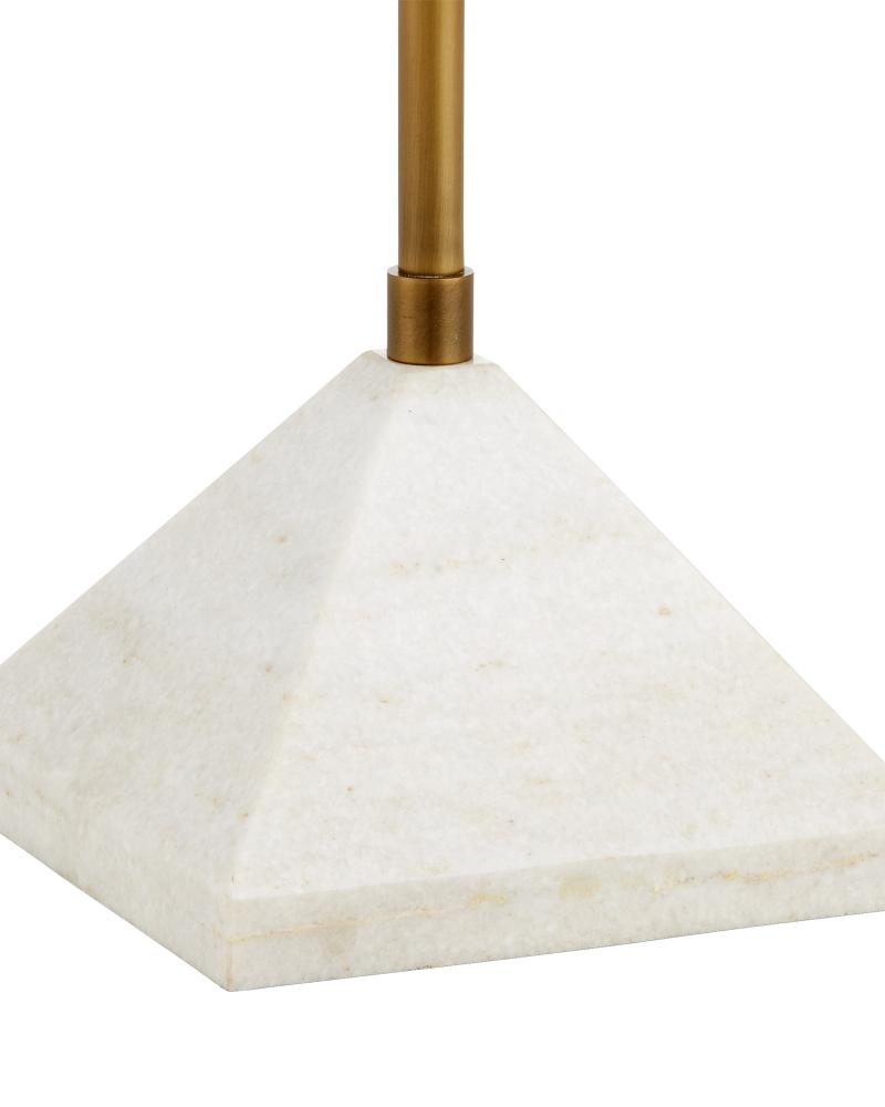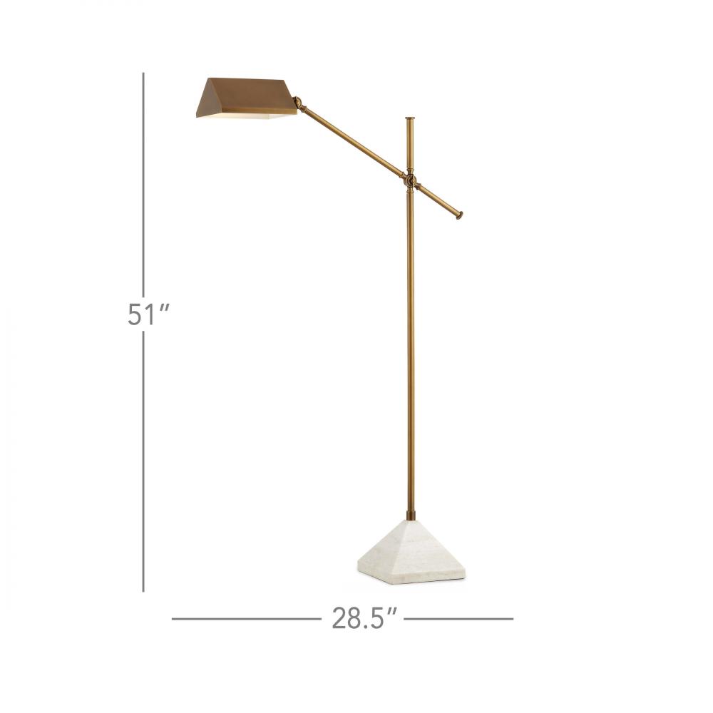 With its base made of a solid pyramid of marble, the Repertoire Brass Floor Lamp is adjustable at the shade and the arm for the ultimate in flexibility. The antique brass-finished metal is a warm contrast to the pale white marble. Though the shape of the shade brings the gold floor lamp a nostalgic touch, the contemporary design with its seriously thin profile has an ultra modern feel to it.