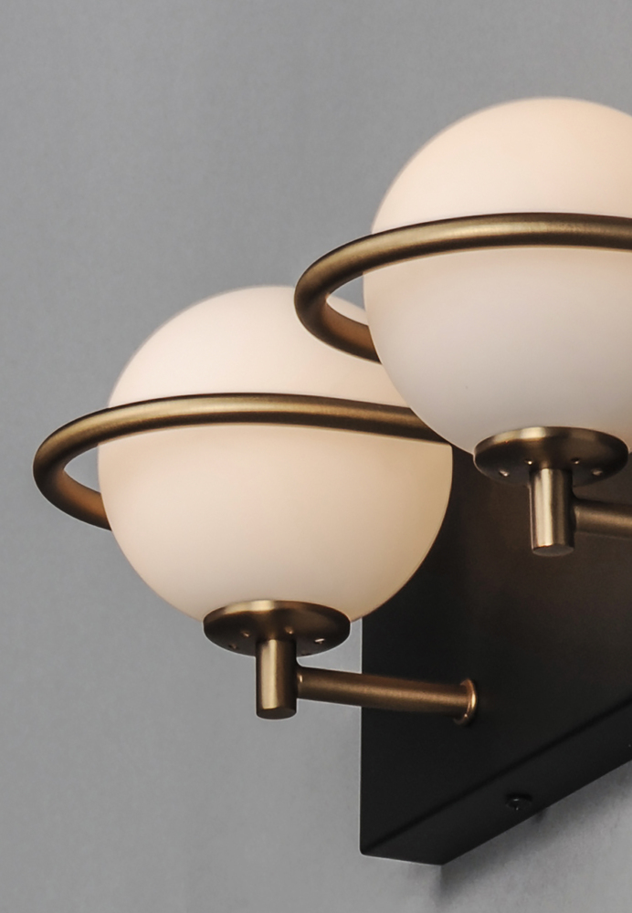 Satin White glass globes are nested behind rings of Gold which dramatically contrasts against the Black metal background. A bedside single sconce features a slim on/off rocker switch that adds convenience to the stylish design. Soft and natural light is pr