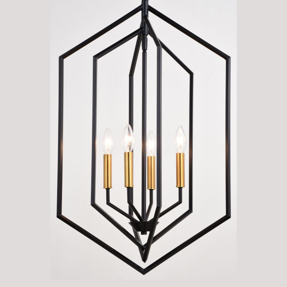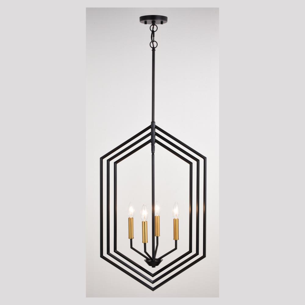 The sharp geometric lines of the Riley collection coordinate well with contemporary and modern spaces. The black metal nested frames showcase the satin brass candelabra light source within. Rotate the shapes into a flat plane for a more linear look. Or space the arms apart for a more dimensional look. This ceiling pendant is ideal for a variety of kitchen, dining, or foyer spaces.
