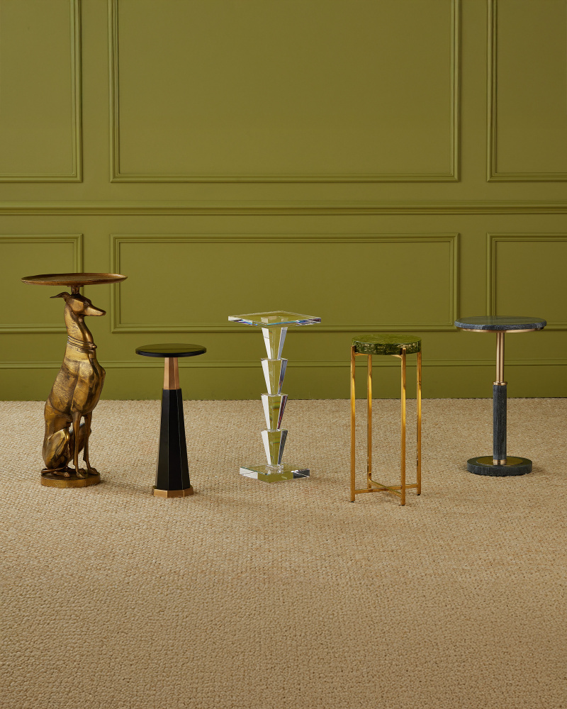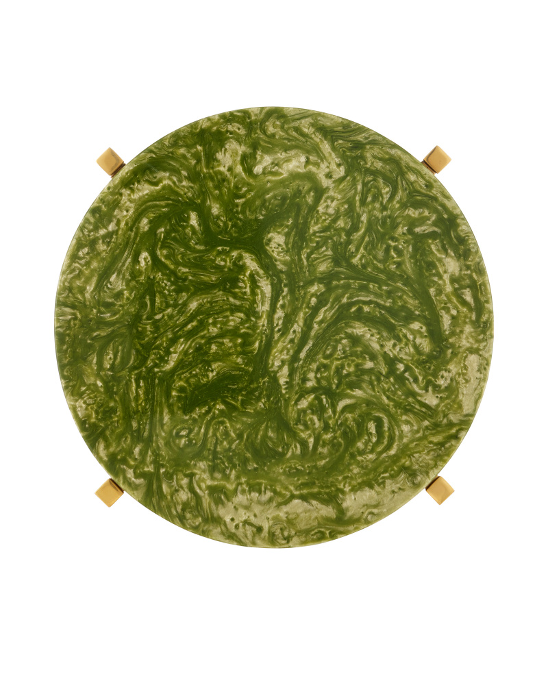 The Rina Green Drinks Table has a top with a swirling surface created when pearlescent powder was mixed with composite to create the organic patterning. The round disc is inset into the metal frame like a gem. Four legs made of stainless steel in a warm brass finish are connected by an ex-shaped stretcher. The gold and green drinks table stands just over 23e inches tall and is 11 inches in diameter, which makes it ideal for rooms where space is limited.