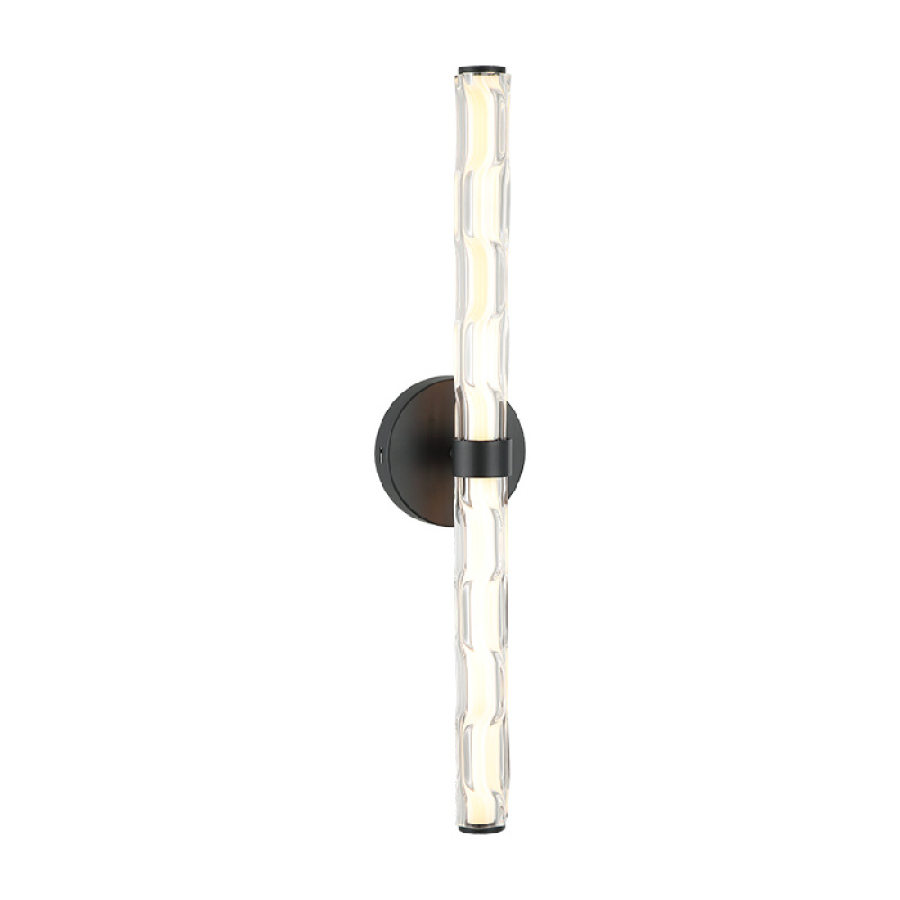 This family features a sleek, modern design with a vertically oriented, elongated cylindrical glass shade that has a wavy, textured surface. The inner 5CCT LED light diffuses through the contoured glass, giving off a soft glow that plays beautifully with the curves adding visual interest and depth. Comes in Aged Gold Brass and Matte Black.