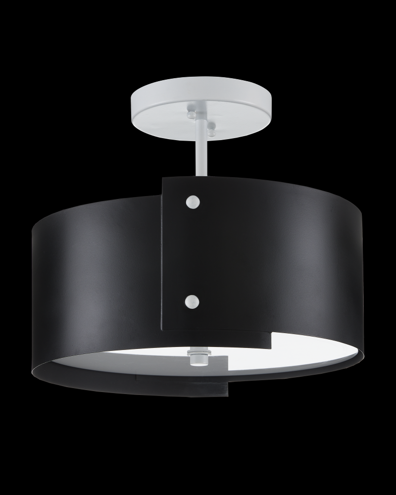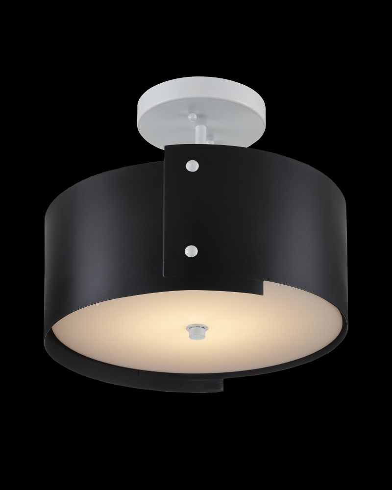 Inspired by Japanese origami, the Ritsu Black Semi-Flush is wrapped in wrought iron panels in a blacksmith finish, fastened with brads that are contrasting elements in sugar white. These match the finial that holds the acrylic diffuser in place and the ceiling plate, the pops of paleness bringing sophistication to this design. The Ritsu is fitted with integrated LED technology.