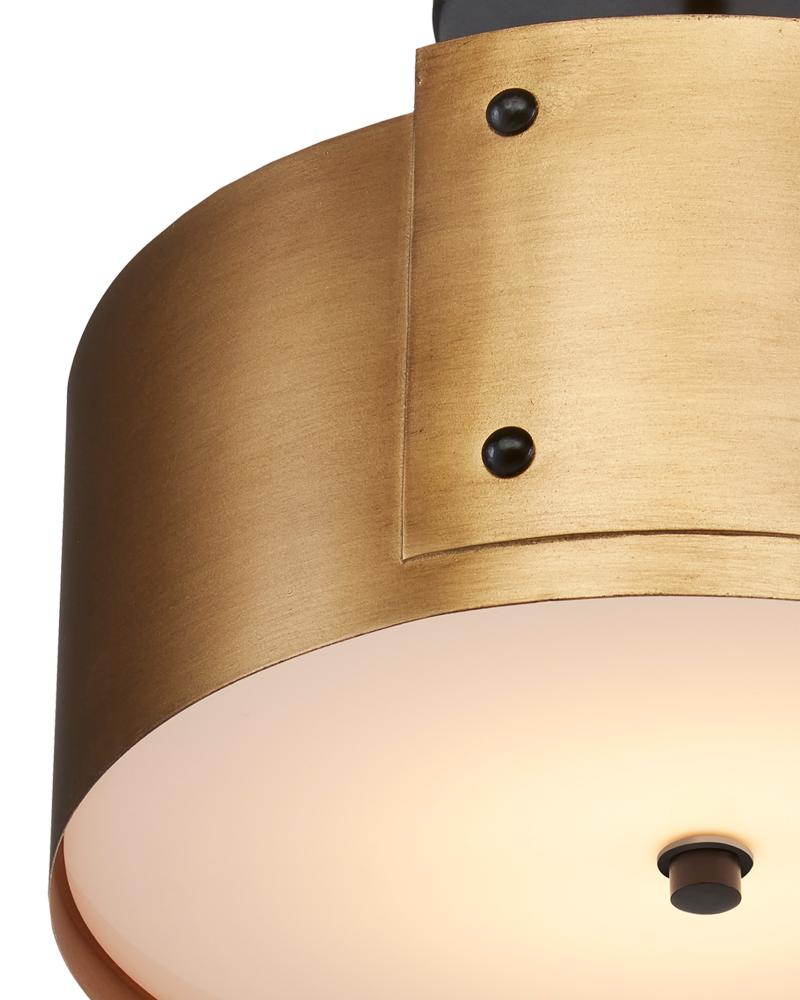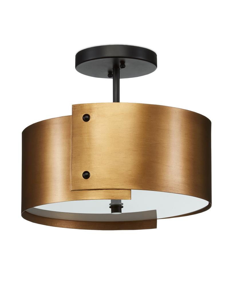 The Ritsu Semi-Flush is inspired by Japanese origami, with its gold form wrapped in wrought iron panels finished in antique brass. The panels are fastened with contrasting black brads, which match the finial securing the acrylic diffuser and the ceiling plate. These dark accents add a touch of sophistication to the design. The Ritsu is equipped with integrated LED technology for modern functionality.