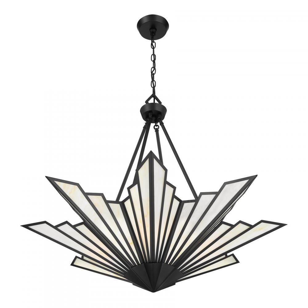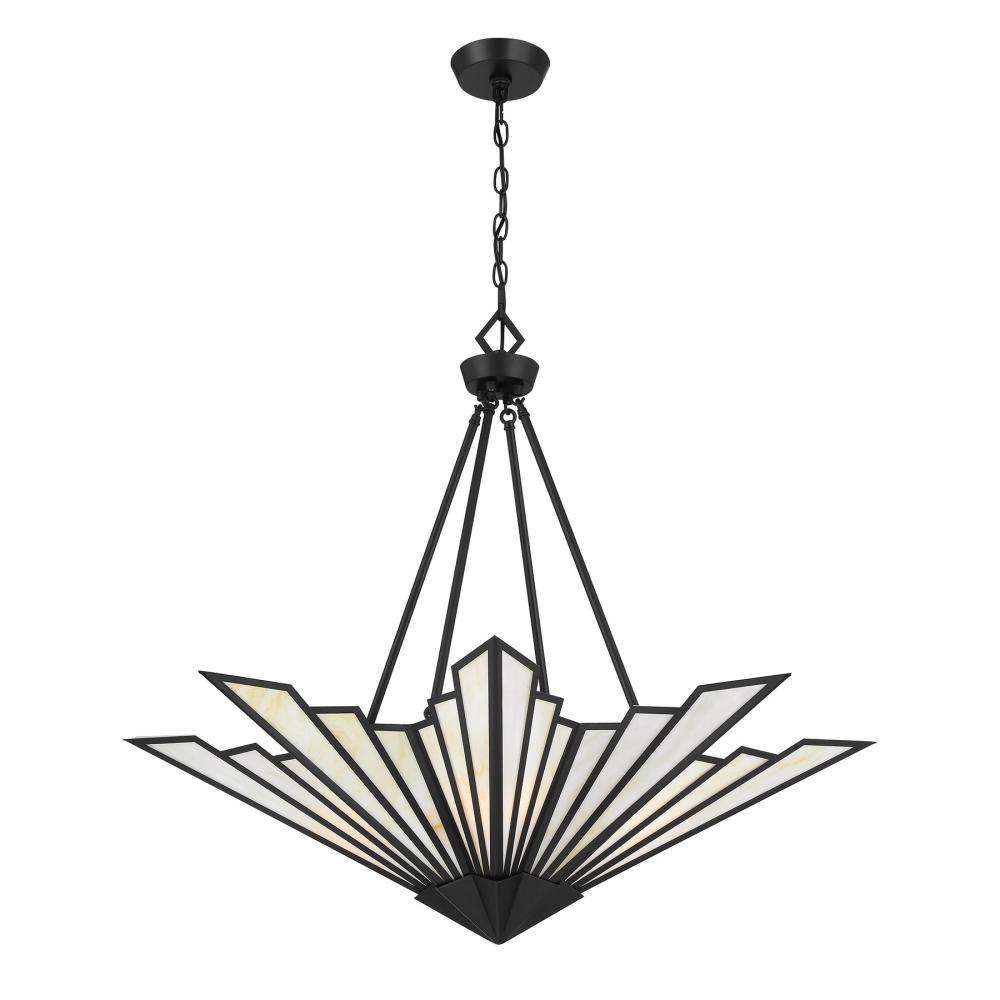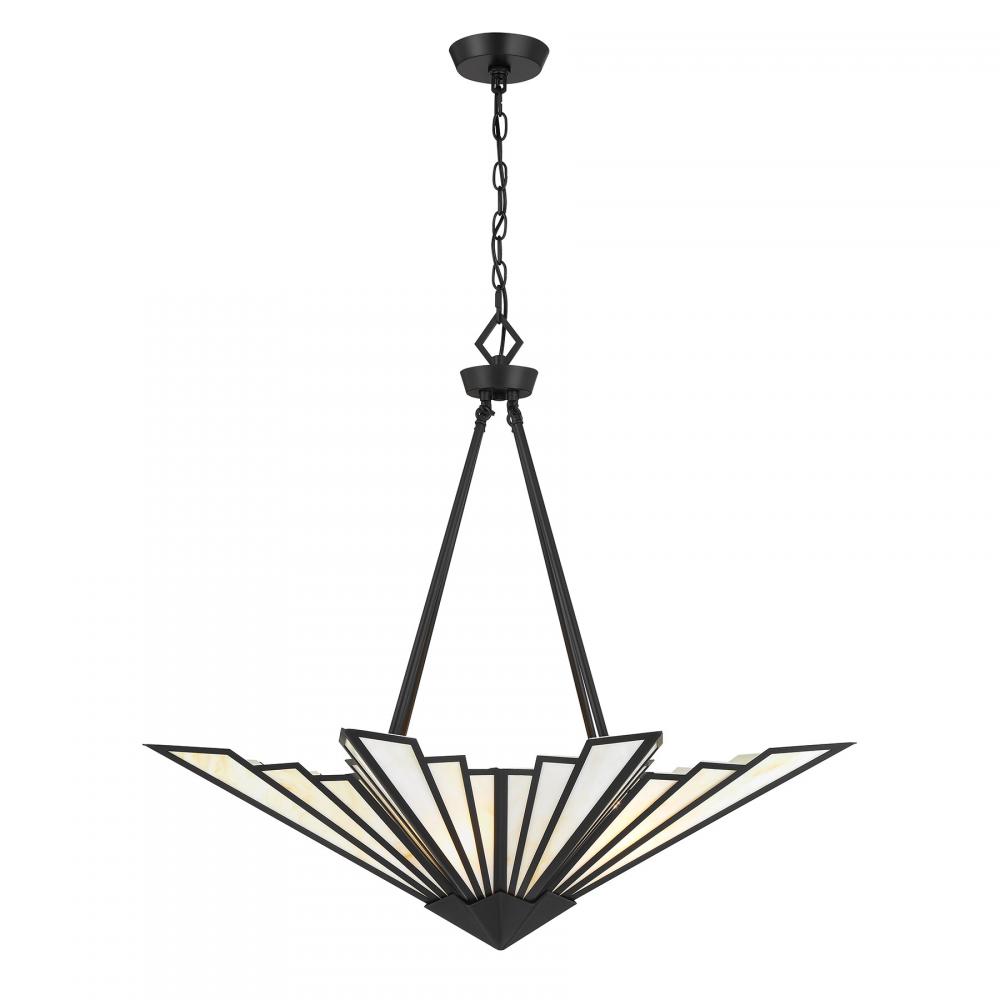 Bring a touch of Art Deco glamour to any space with the chic Savoy House Rivage 4-light pendant. Its fan-like structure is decorated with panes of beautiful Tiffany art glass and finished in Matte Black. Use it alone or in groupings for timeless allure. Rivage is 31” in height and 36” in width. Uses four standard size bulbs of up to 60 watts per bulb. Bulbs not included. Comes with 10 feet of chain.