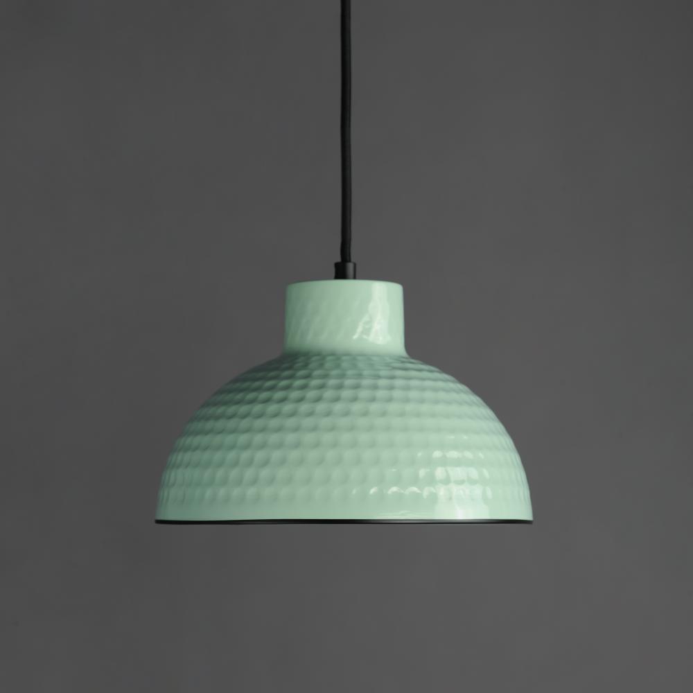 Hammered metal dome shades are painted in glossy enamel paints that welcomes a nautical look. Available in Sage Green with a glossy white interior or Glossy Black with an Antique Copper interior, these pendants embody a nostalgic element that prevails alon