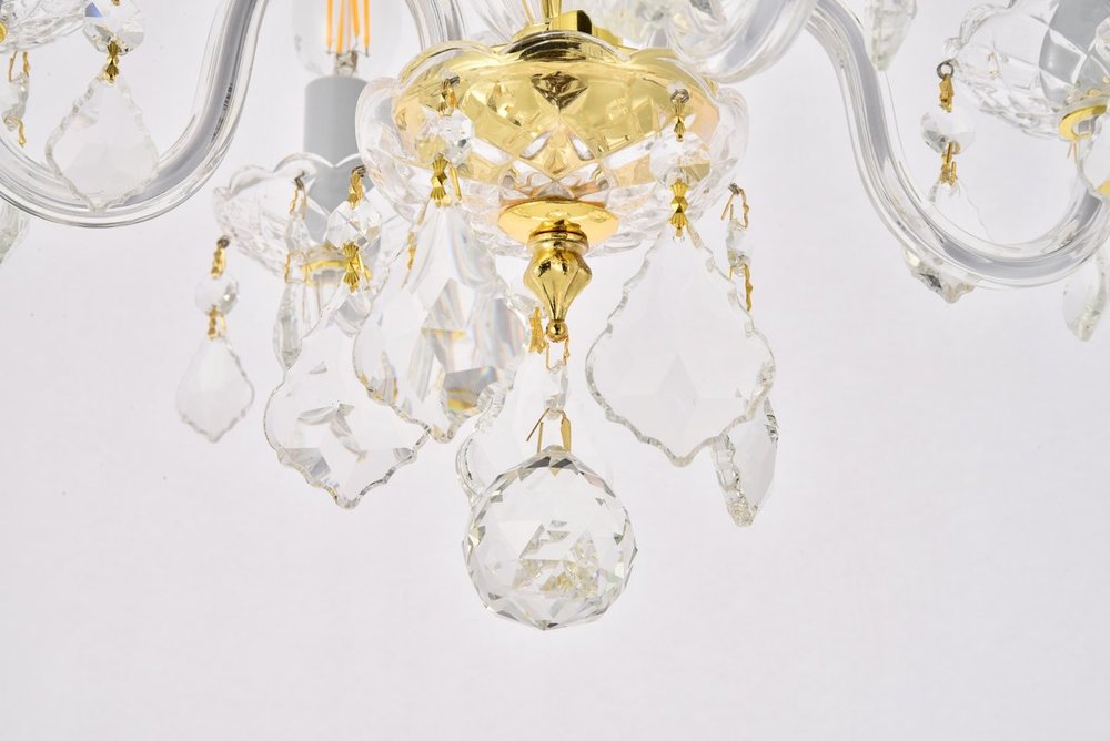 Steel frame with gold finish is highlighted by curved glass arms, a glass vase, and glass holders for the 4 candelabra bulbs