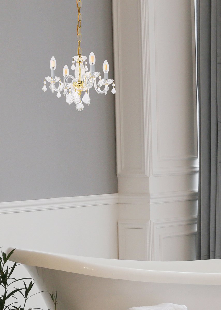 The 7804 Rococo collection was inspired by the lavish elegance of 18th century France, known for its graceful curves and light colors. The steel frame, available in an array of finishes, is highlighted by curved glass arms, a glass vase, and glass holders for the candelabra bulbs. Dangling from the delicately etched glass plates on three levels are royal-cut octagon and pendeloque crystals. It all comes together with a faceted glass sphere at the bottom. Optional shades of acrylic and organza add coziness to the glam. Petite in size yet grand in appearance, Rococo hanging pendants are perfect for enhancing the décor of smaller areas in your home.