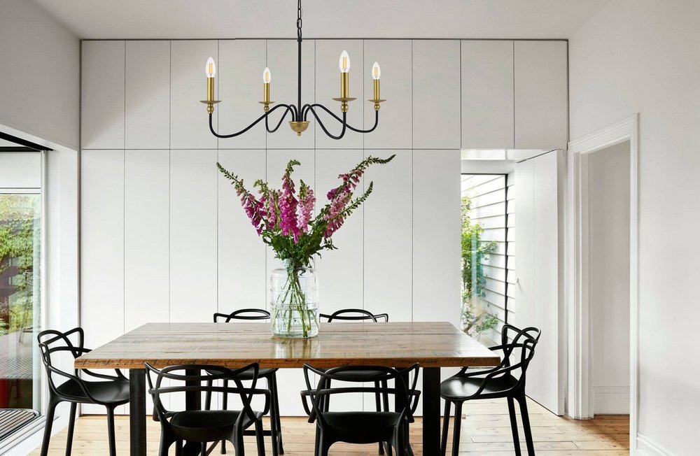 Simple elegance--that's really all there is to it with the Rohan collection pendant lamp in a brass and Matte black finish. Despite the gentle undulating arms, it strongly supports the illuminating lights that will bring about peaceful joy and merriment to your home. Simple is always best, and this light proves it. The perfect addition to any home large or small, you will find that its modest glamour will fit anywhere from your living room to your bedroom.