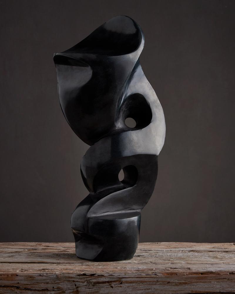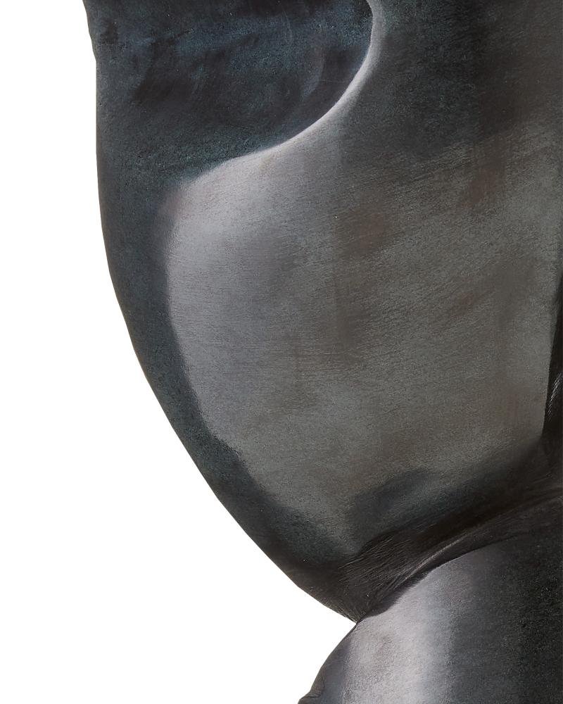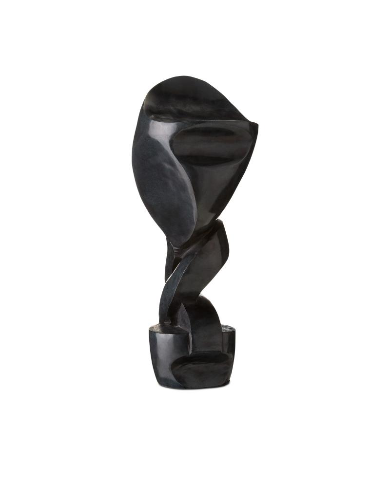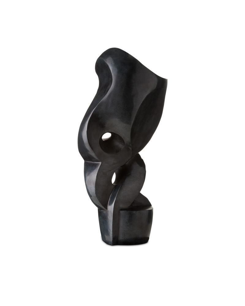 Modern art at its best defines the Roland Black Marble Abstract Sculpture that is made of marble after a clay model created by a sculptor in the U.S. The shape that emerges as the stone is chipped away is given a sheen when it is sanded and polished. One of the most artful aspects of this black sculpture is that its personality changes when the piece is rotated.