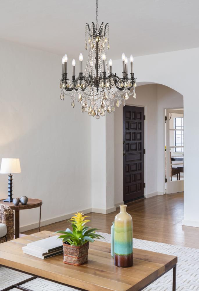 Rosalia collection hanging fixtures bring the decadence and splendor of Austro-Hungarian royalty into your home. An empire-style frame with curved stylized arms bears exposed bulbs (not included) above while strands of draped octagon crystals and precision-cut crystal pendeloques shimmer below. Available in bold finishes (dark bronze, French gold, and pewter) that hint at the design’s vintage-inspired origins, and with clear or golden-teak crystals, your guests will appreciate the royal treatment. Splendid in a dining room, stairwell, or living room.