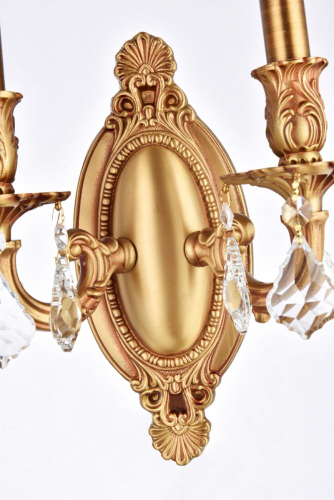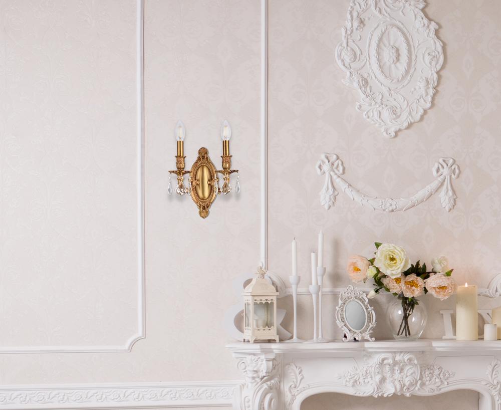 Rosalia collection wall sconces bring the decadence and splendor of Austro-Hungarian royalty into your home. A polished oval backplate with an intricate, etched design supports curved arms that bear exposed bulbs (not included) above while precision-cut crystal pendeloques shimmer below. Available in bold finishes (dark bronze, French gold, and pewter) that hint at the design’s vintage-inspired origins, and with clear or golden-teak crystals, your guests will appreciate the royal treatment. Splendid in a bathroom, hallway, or bedroom.