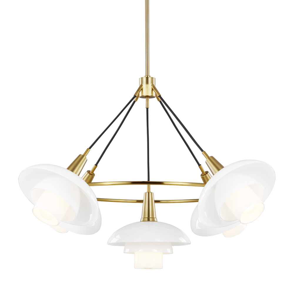 The Rossie five light single tier chandelier in Burnished Brass from Ellen DeGeneres features hand blown stacked individual layered milk glass shade, creating a sleek look that is both stylish and functional. The table lamp has a metal cascading shade with its light source completely invisible, because it is hidden within the shade. The light is diffused through the opal glass lampshades, which are arranged in a logarithmic spiral.