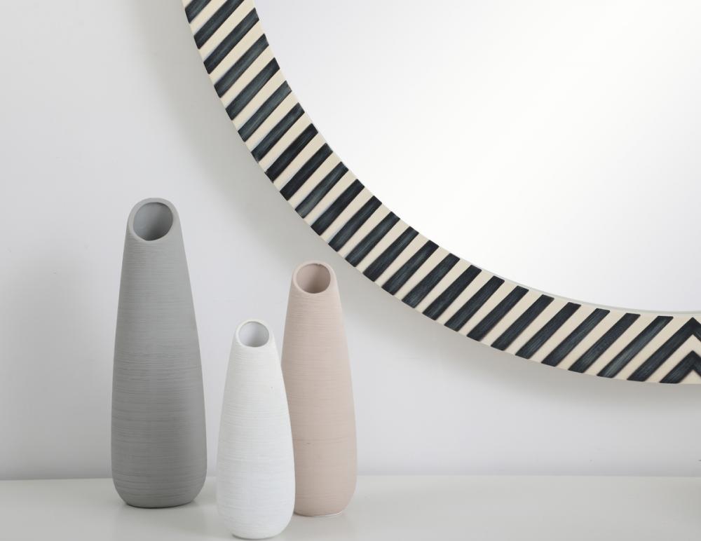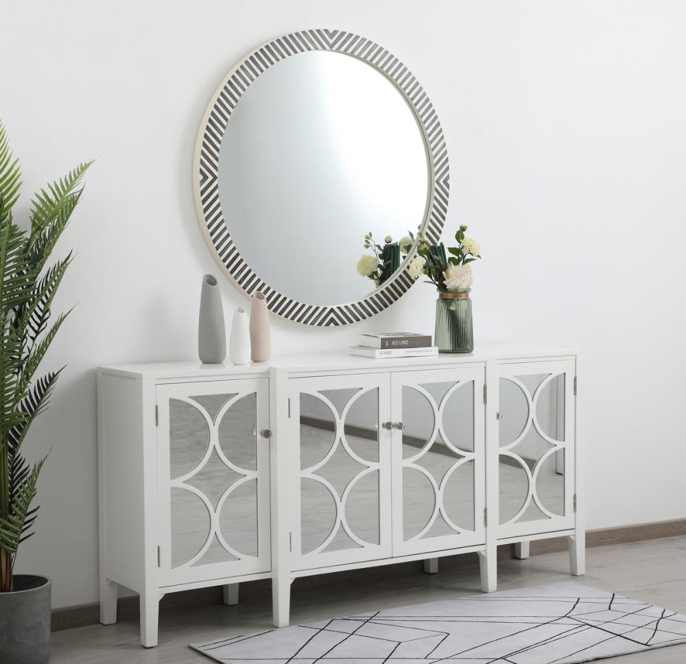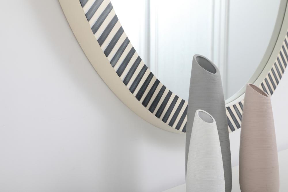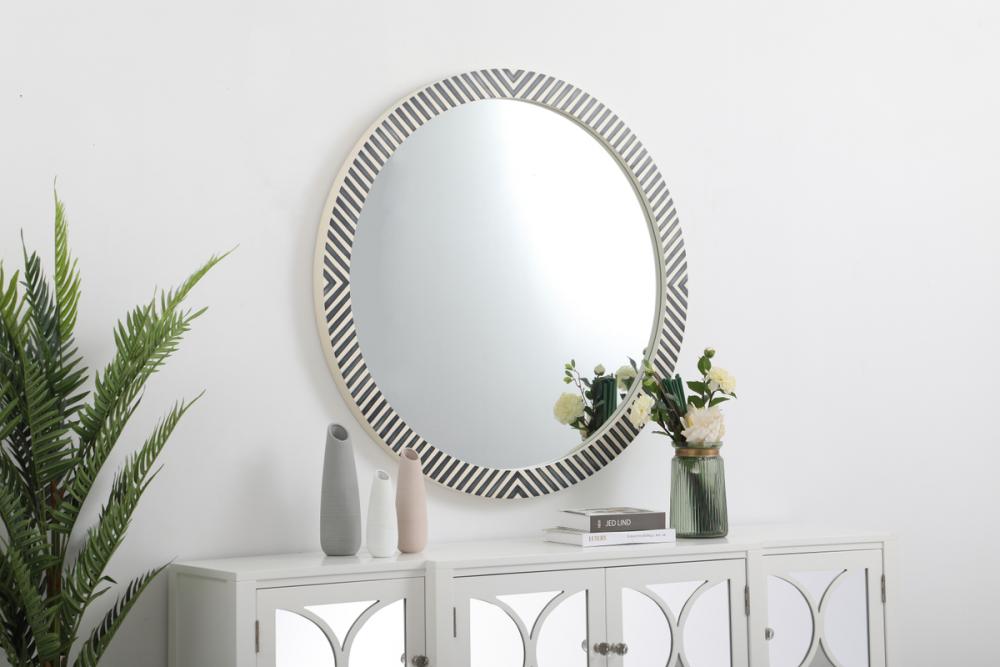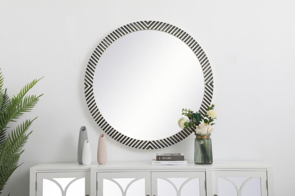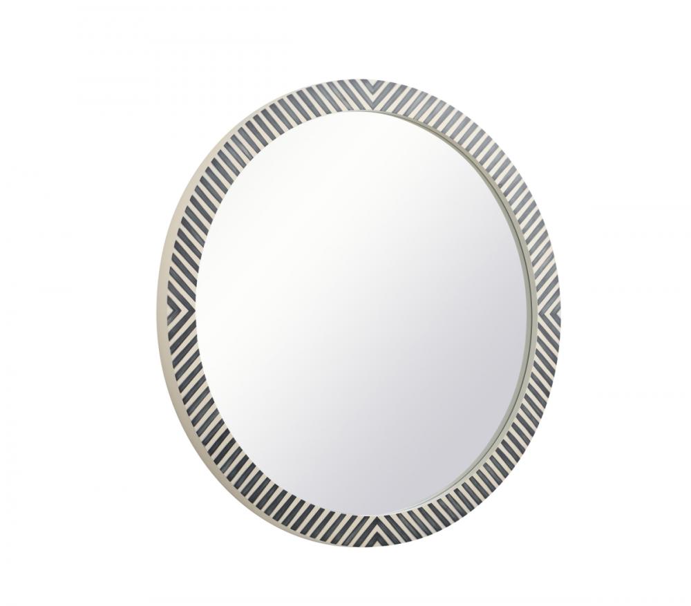 Chic and contemporary, fashionable and trendy, stylish and smart--so many word pairings to describe this casual, yet eye-catching mirror! The black chevron stripes looks as if hand painted on the white frame, giving it an "imperfect" brushed texture. But this "imperfectness" gives it stunning character and liveliness. This round mirror will surely create an exciting atmosphere anywhere in your home.