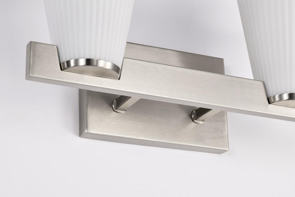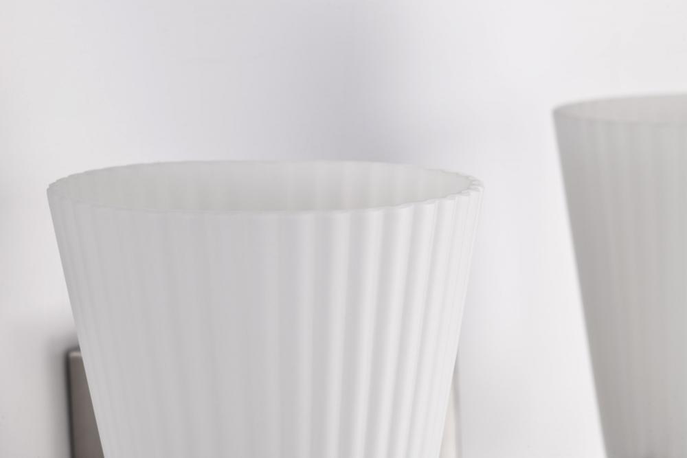 Indulge in the glamour of the Royale 60-8722 two light vanity fixture, where sleek Art Deco silhouettes meet modern refinement. The satin white pleated glass adds texture and sophistication, diffusing light with a soft, radiant glow. Finished in burnished