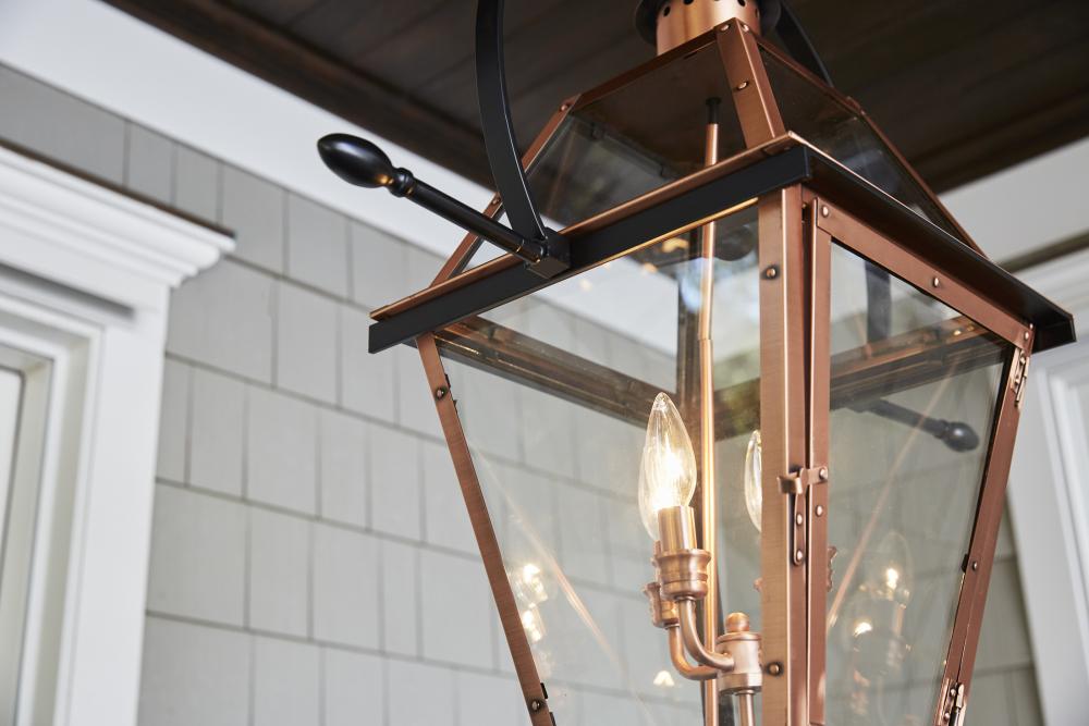 From the Charleston Copper Lantern Collection this piece gives you the historic look of gas lighting but without the hassle of a propane feed. It is all electric solid copper and hand riveted giving your home the romantic reproduction style of antiqu